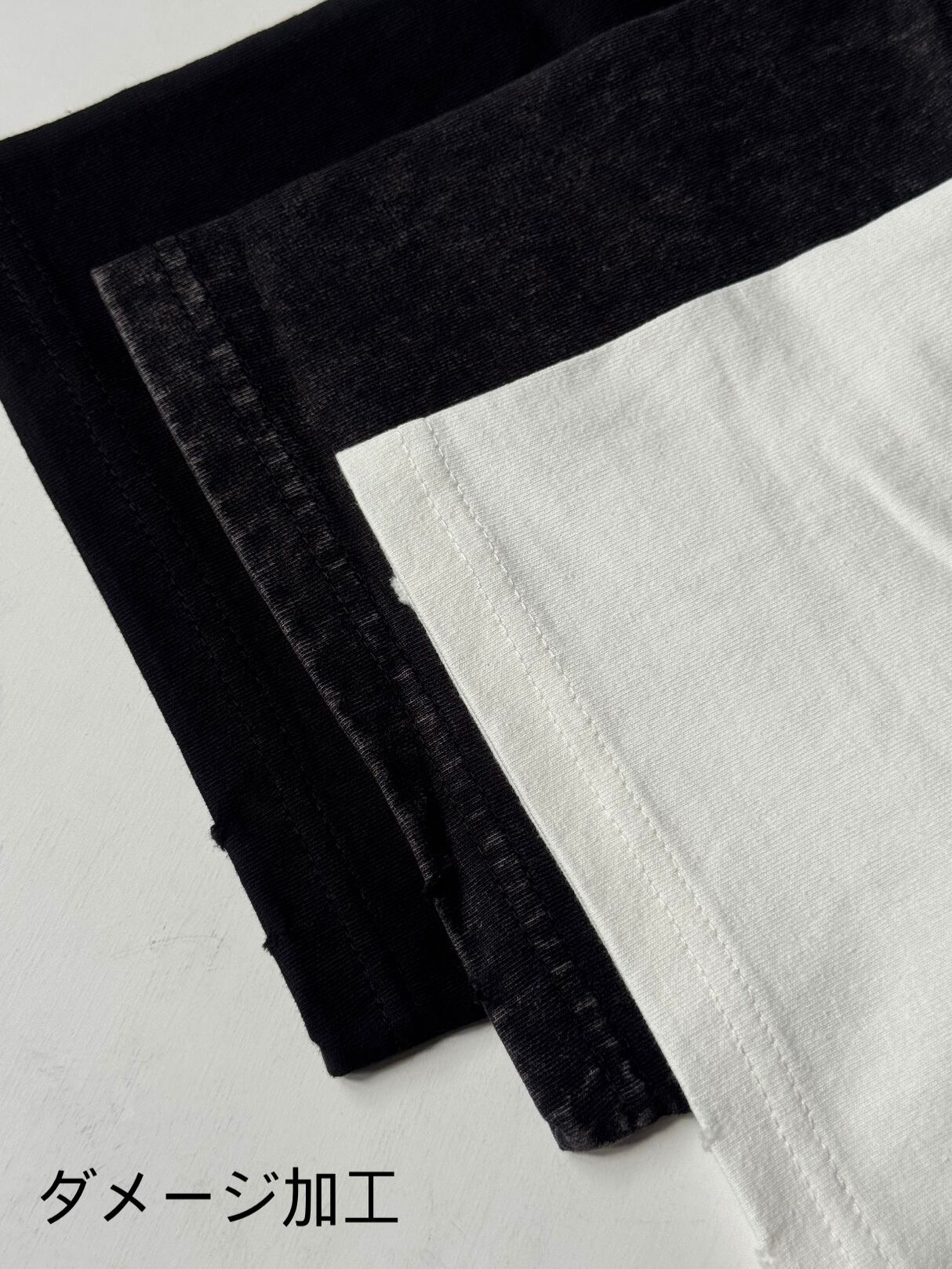 しっかり装備のヴィンテージ、ダメージ加工Tシャツ。