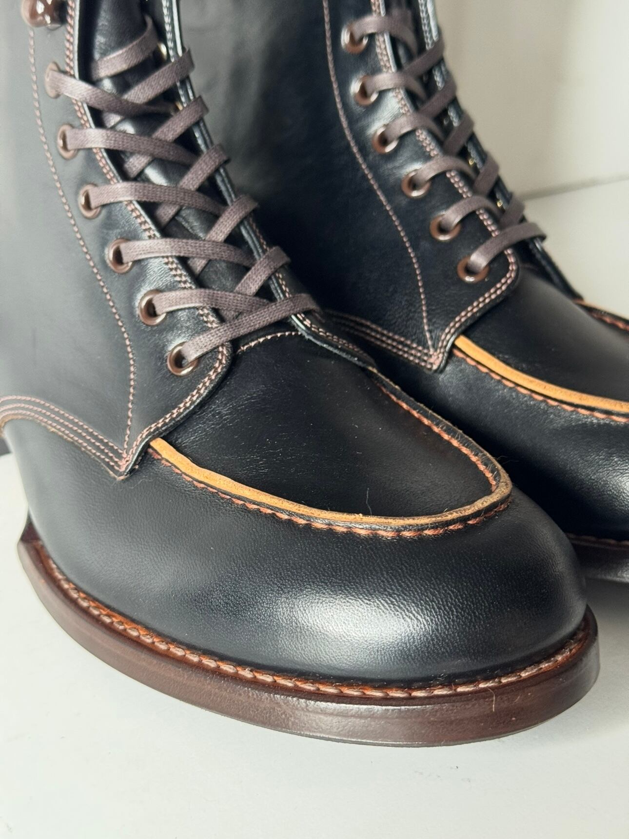 この丈の高い「ブーツ」は、屋外での危険を伴う仕事や、アウトドア活動などで広く履かれていました。Grand Sportif (グラン・スポルティフ) は、そうしたふくらはぎ丈(中底から履き口まで US 8 サイズで 25cm となり、約10 インチ丈)のモカシン型のブーツです。ラスト、丈以外のデザイン、製法、ソールなどは 定番 Sportif と同様ですが、アッパーの革は Sportif とは違って、イタリア産の馬革(ホースフロント)の下地を日本で黒染め加工して茶芯としたものを使っています。