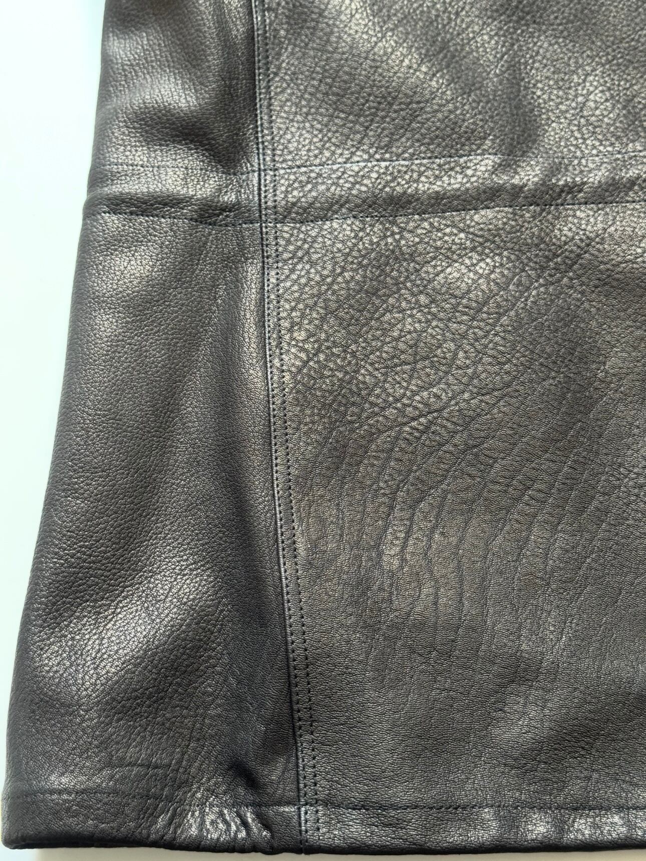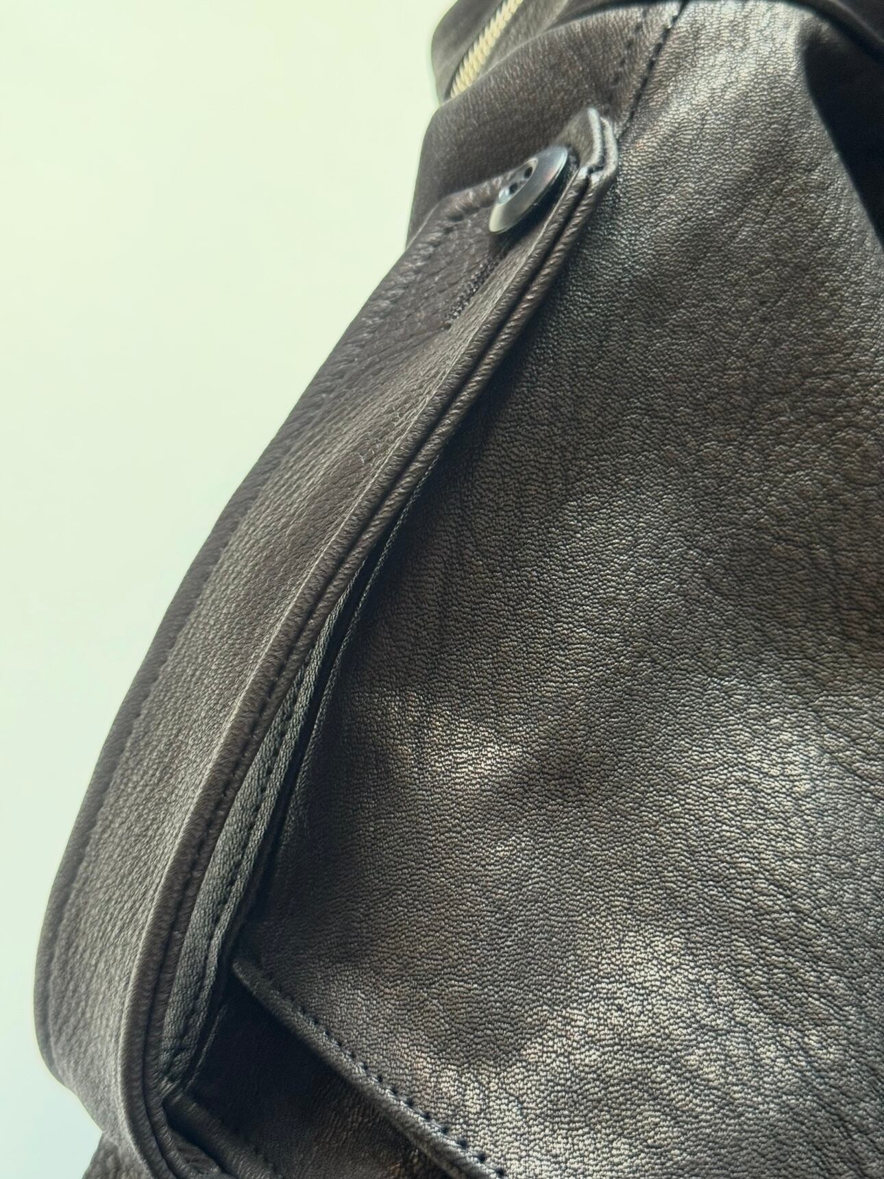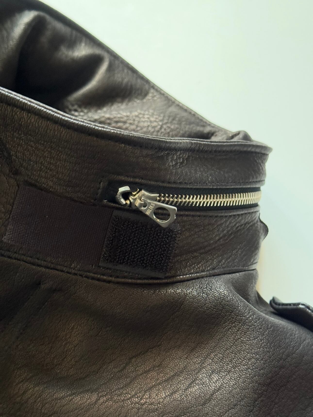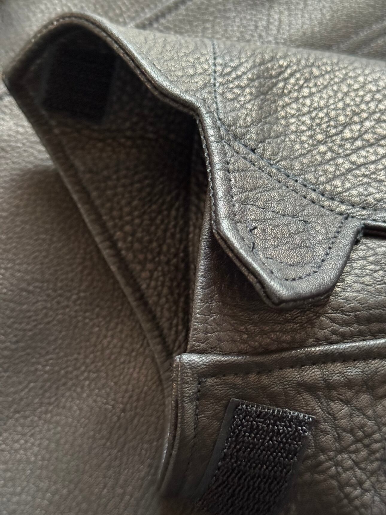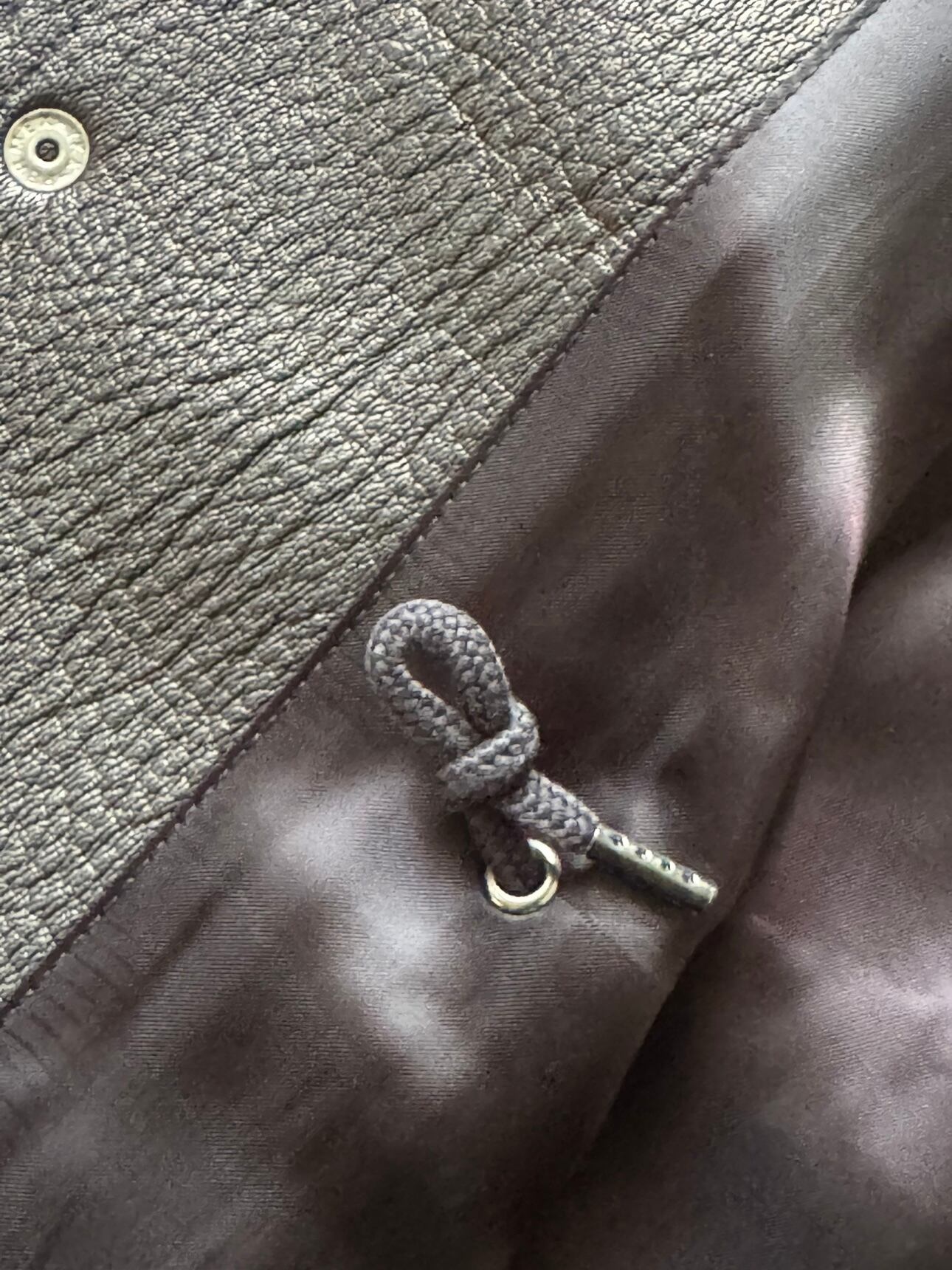 レザーはフルベジタブルタンニンの鹿革を芯通しで仕上げ、1.6mm厚を1.2mm厚に割った革を使用し、フード部には0.3mmの革を使用。