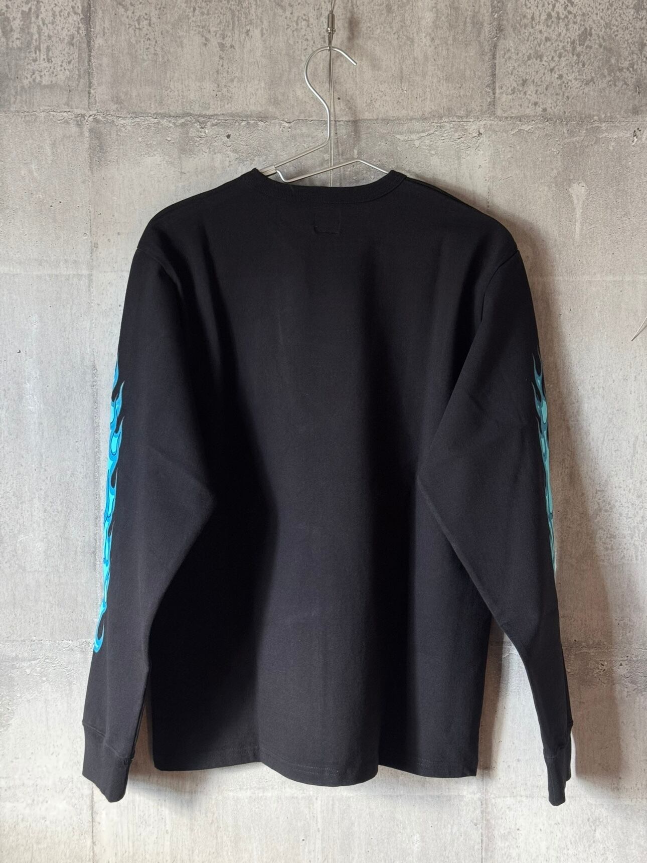 このロンTのボディには、20/2スーパー度詰め天竺という非常に頑丈な素材を使用しています。この素材は、昨年Tシャツとして復活したもので、長期間着用しても形崩れせず、その耐久性が高く評価されています。今回は新たにこの素材を用いて、ロングスリーブTシャツを製作しました。袖口にはリブを採用し、一枚で着用してもシルエットが崩れず、しっかりとしたフィット感を実現。これにより、どんな体型の方でも自信を持って着こなしていただけます。他にはないスーパーヘビーなTシャツであり、その堅牢な素材とユニークなデザインは、どんなシーンにもマッチします。ファッションのアクセントとして、一枚で着こなすことも、レイヤードスタイルに取り入れることもできる、非常におすすめのアイテムです。ぜひ、この「FLAME SLEEVE TEE」で新しいスタイルを楽しんでください。
