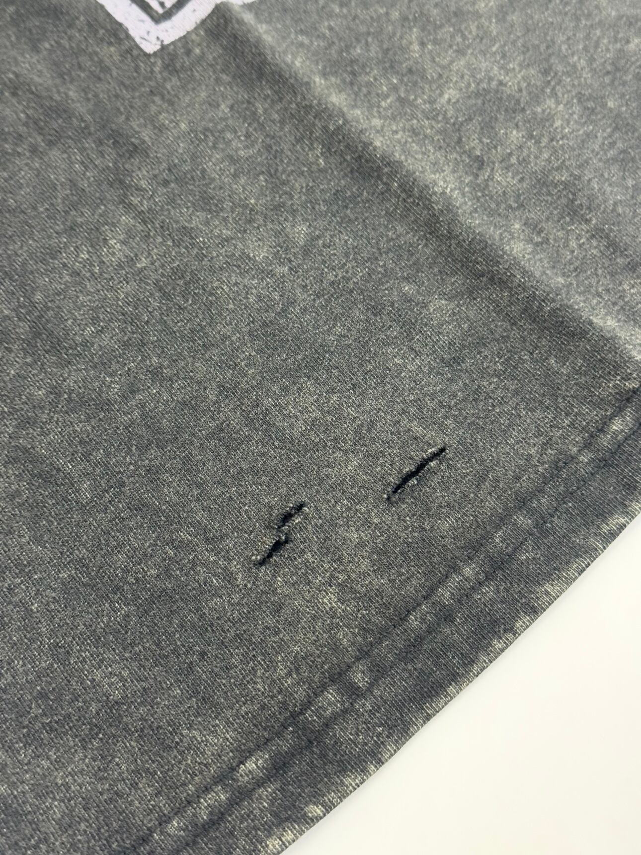 しっかり装備のヴィンテージ、ダメージ加工Tシャツ。