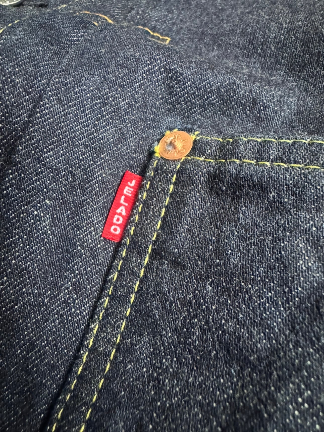 ロープ染色はデッドストックを参考に深みのあるピュアインディゴで染め上げ、TOYODA G3織機で経68本×緯47本の打ち込みを施し、しなやかで滑らかな穿き心地を実現しました。デザインは、弊社所有のS506XX初期型をベースに、当時の大戦モデルの雰囲気を忠実に再現。通常ラインで使用される刻印入りの付属を再現し、ポケットにはフラップを付けず、シンプルな1stモデルの仕様を踏襲しています。30年代から使用されていたリベットの在庫をそのまま流用したという設定のもと、「JELADO Co」の"o"を小文字にした特注リベットを製作。尾錠も30年代のバックルを型から再現し、鉄製で仕上げました。