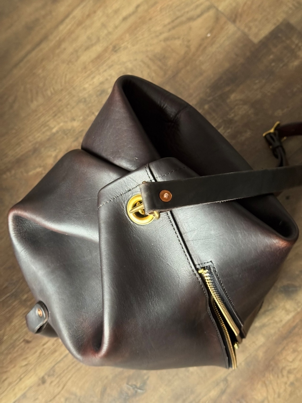 レザーはミモザやチェスナットから抽出されたタンニンで鞣された、姫路産フルベジタブルタンニンレザーを" 丘染め" と呼ばれる伝統的なハンドメイド製法で一枚一枚丁寧に染め上げた後、オイルをたっぷり染み込ませ、独自のコガシ加工によりヴィンテージのような風合いに仕上げたオリジナルレザー「OLD OIL」を使用。使い込むほどに艶と風合いが増し、長く経年変化をお楽しみいただけます。
