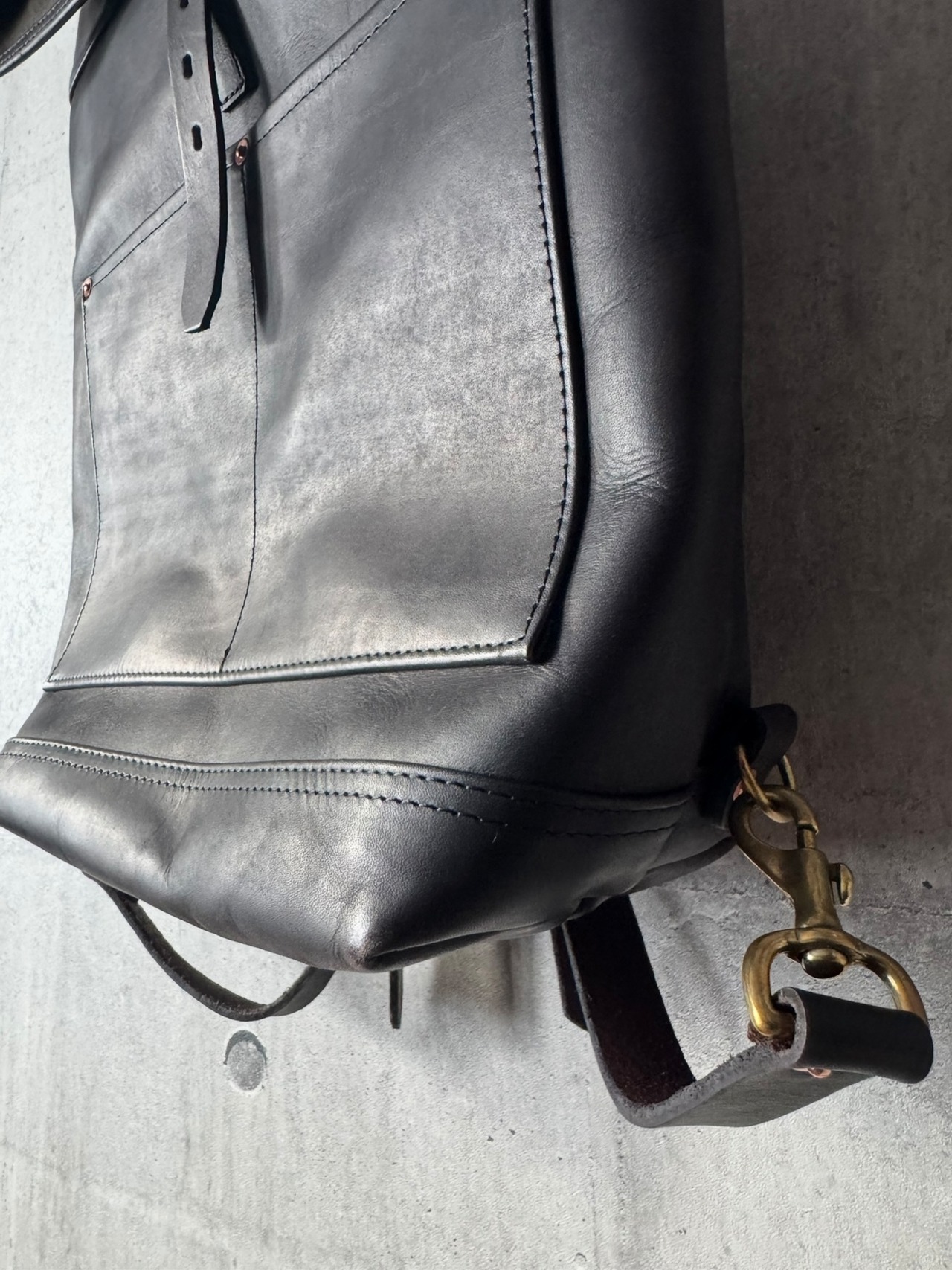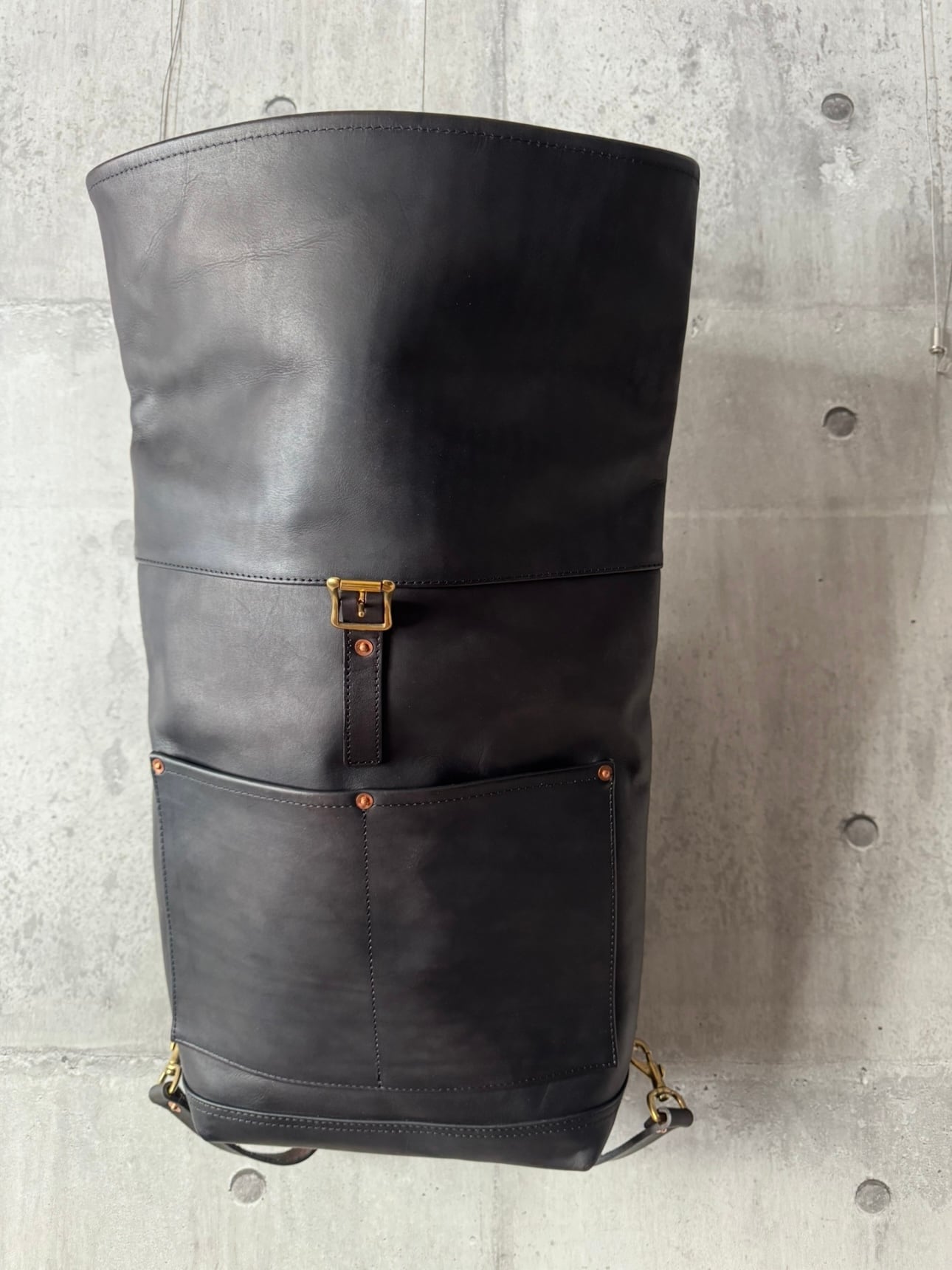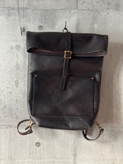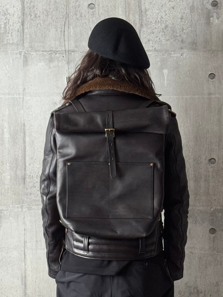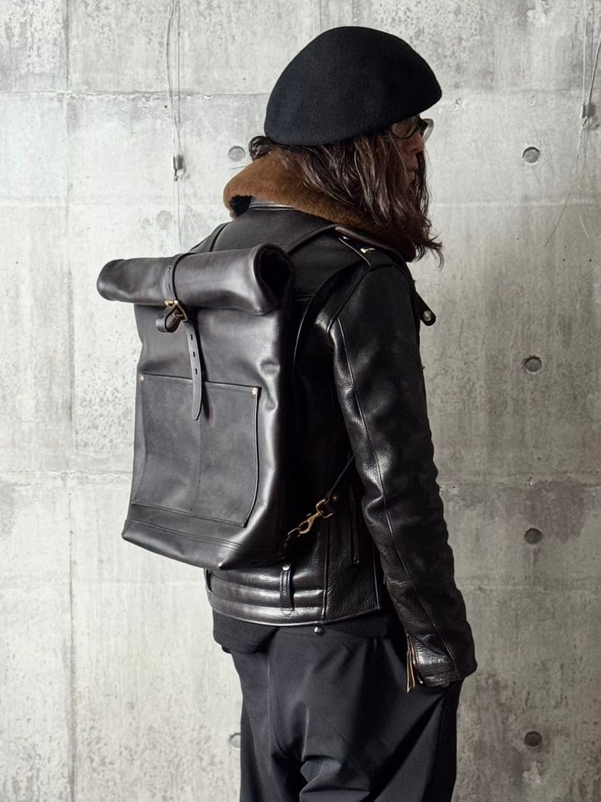 ロードバイク愛好家に指示される、ロールトップリュックサックをモダナイズした、レザーリュックサックです。