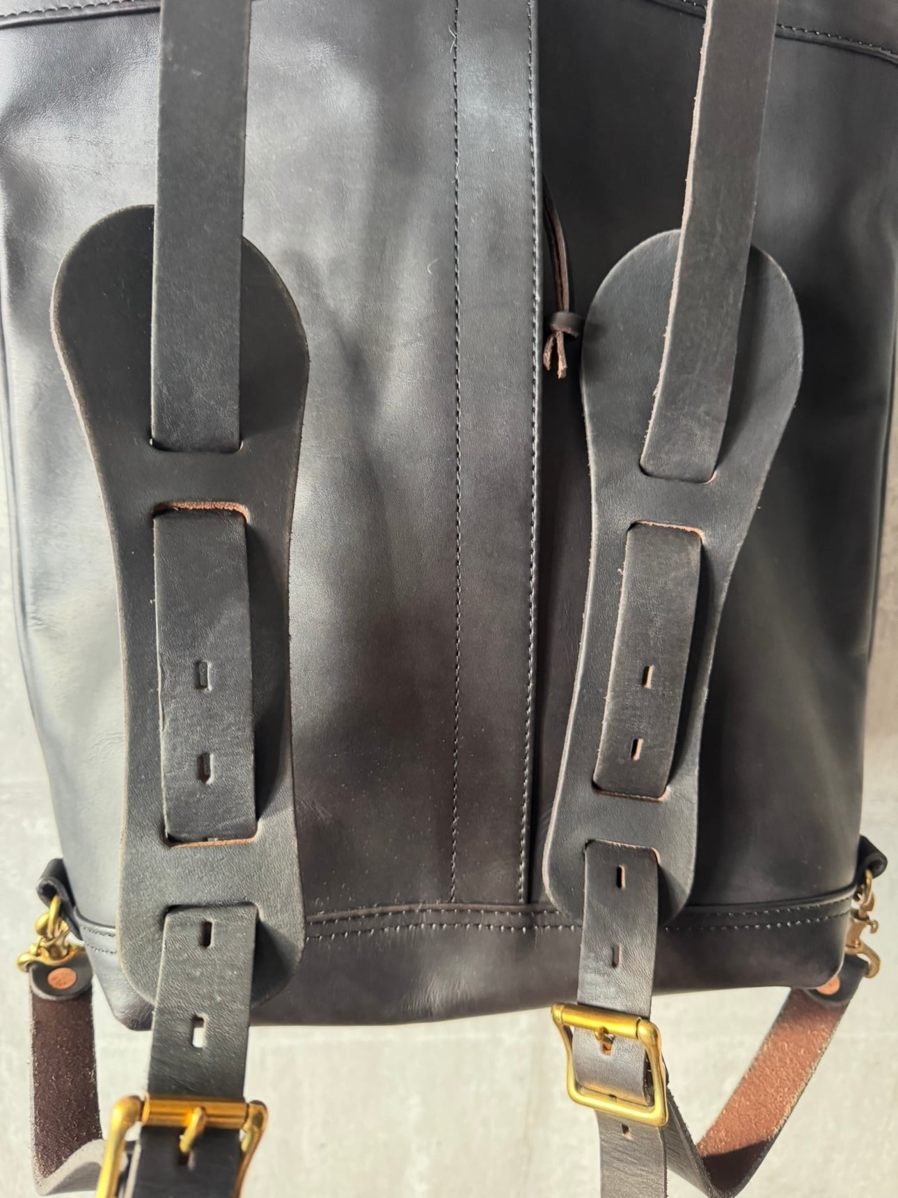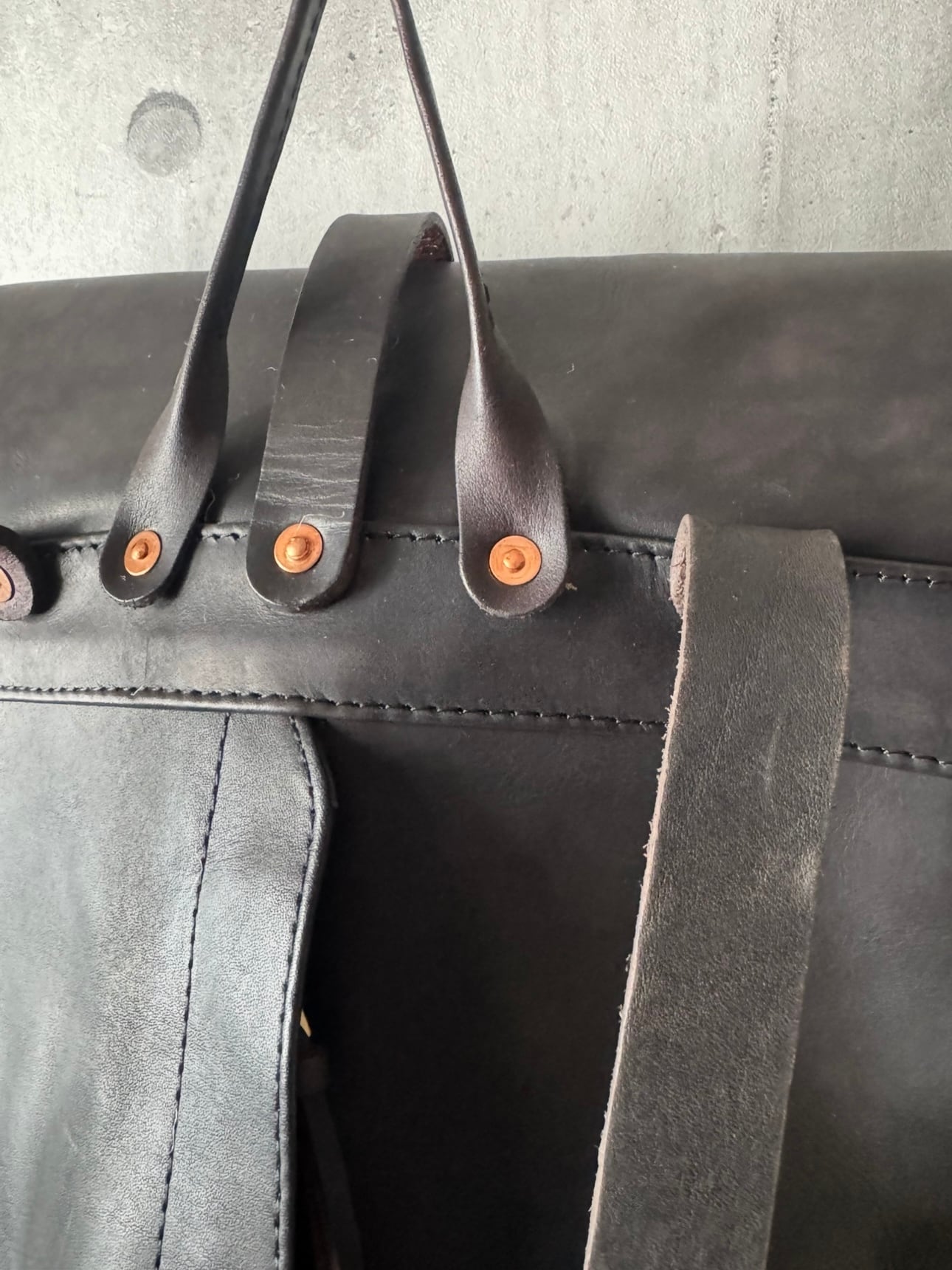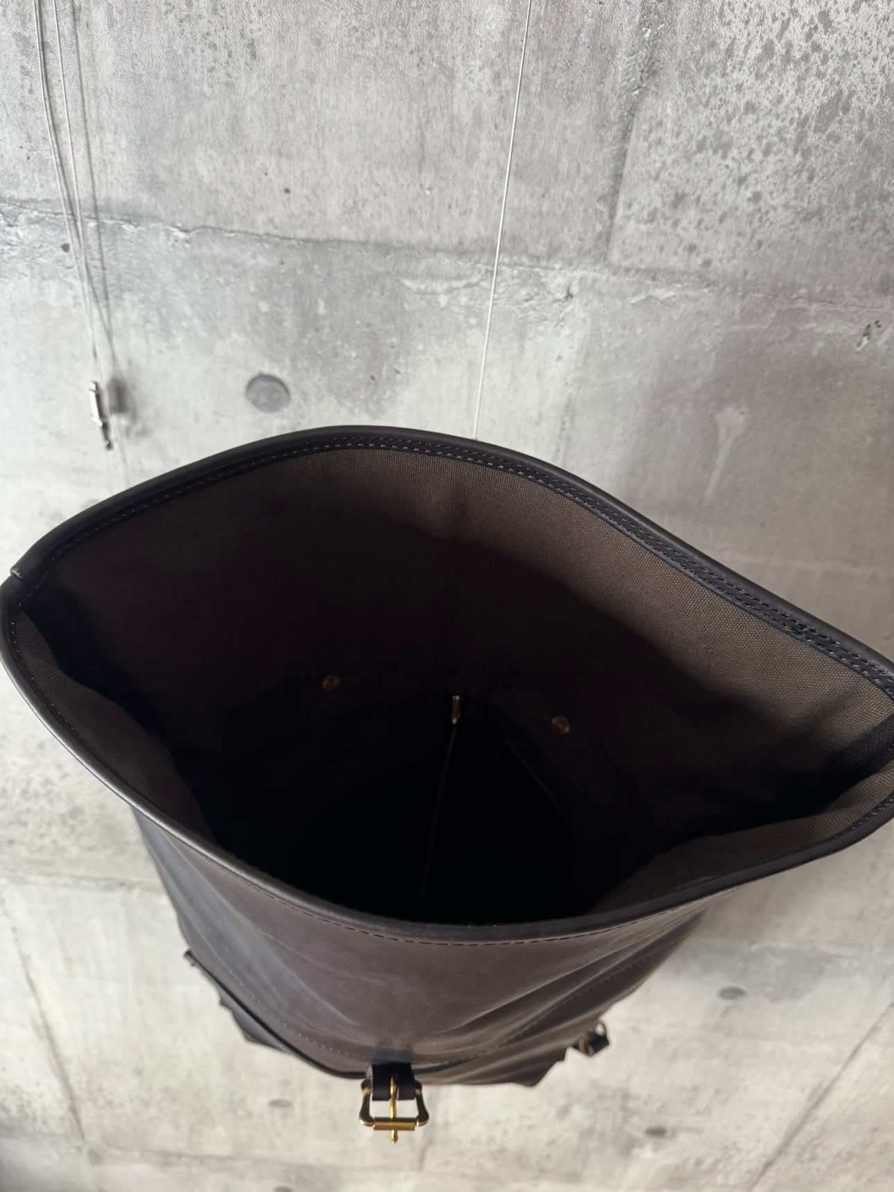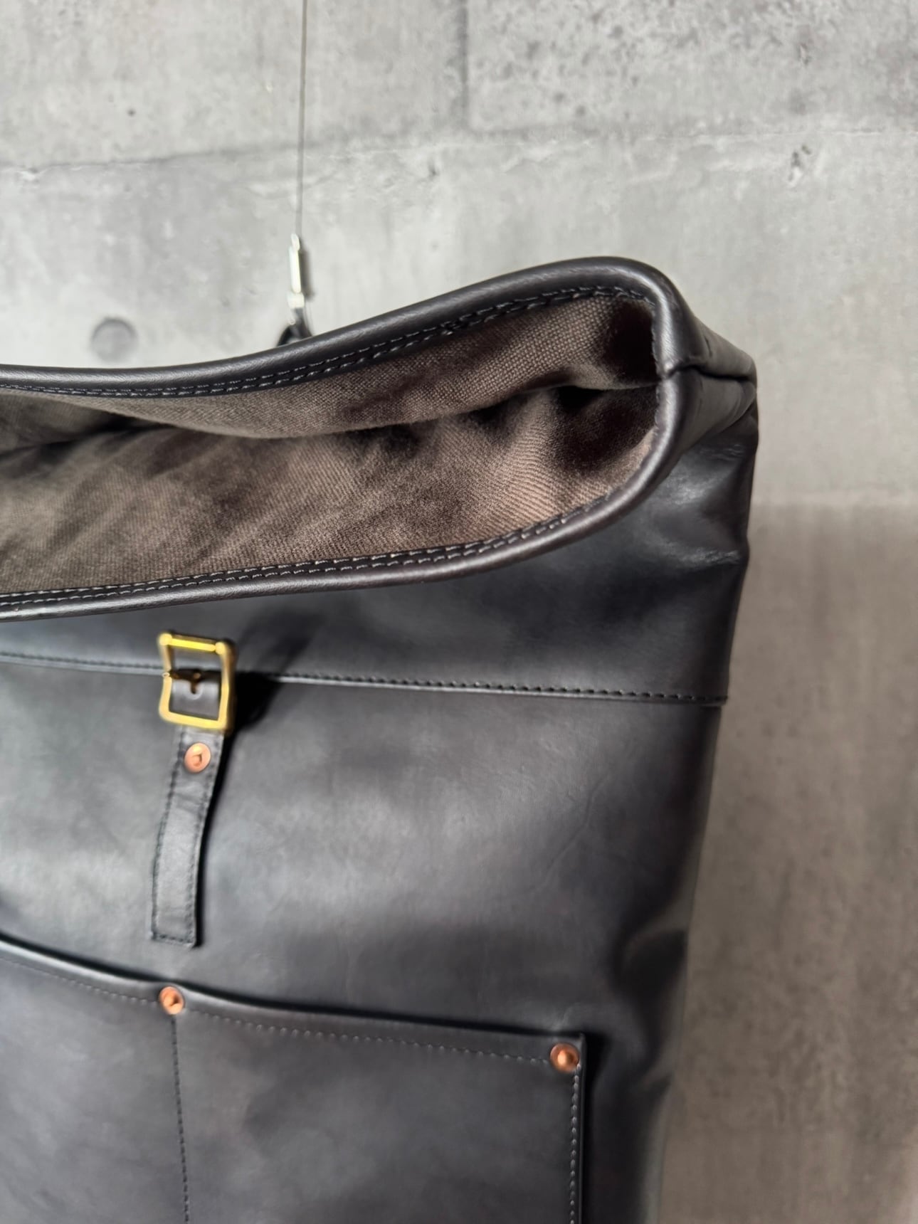 ロードバイク愛好家に指示される、ロールトップリュックサックをモダナイズした、レザーリュックサックです。