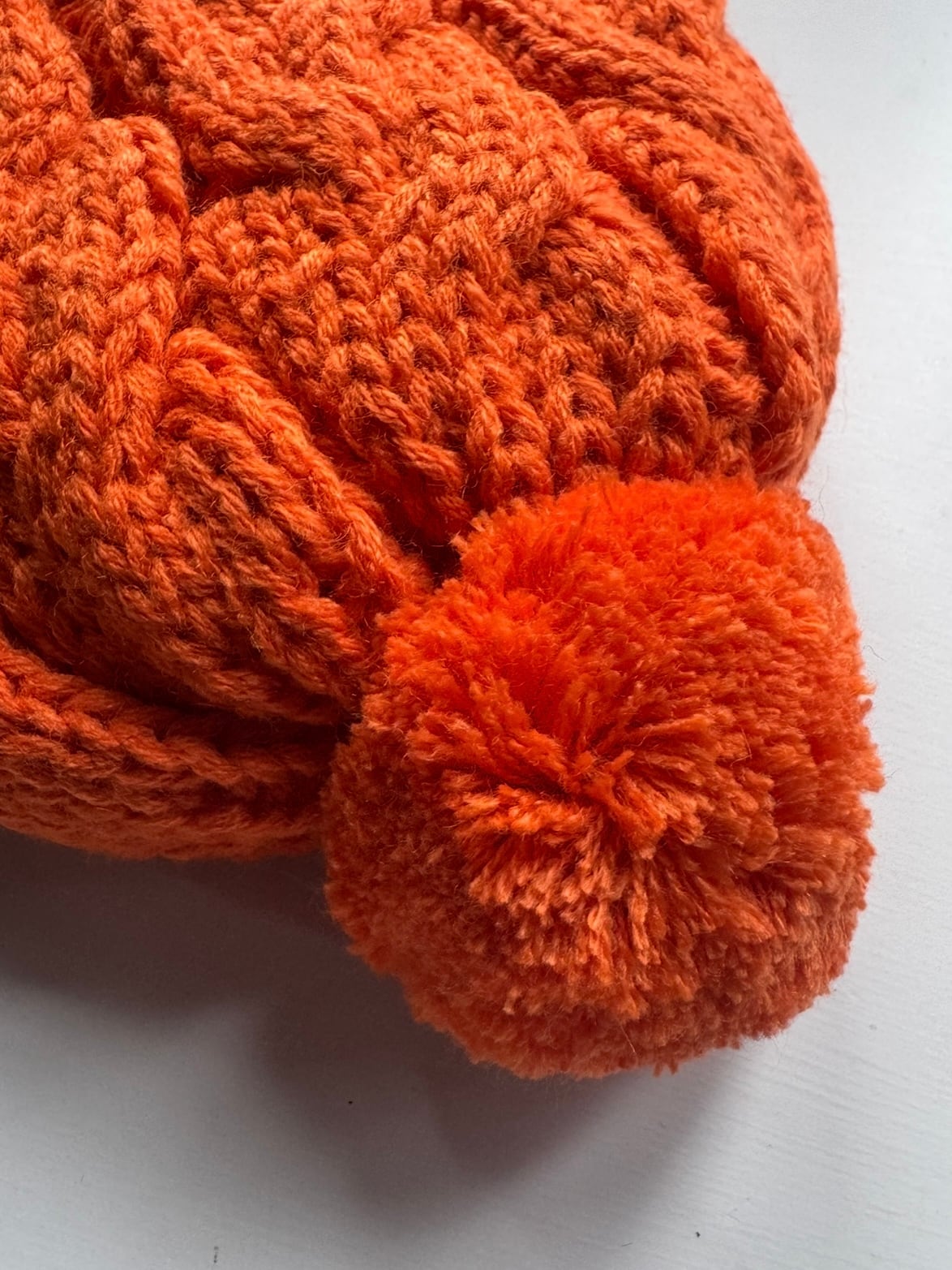 直径6cmのポンポンが付いた、ケーブル編みと折り返しリブを組み合わせたニット帽。