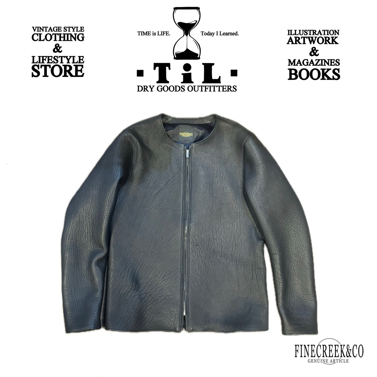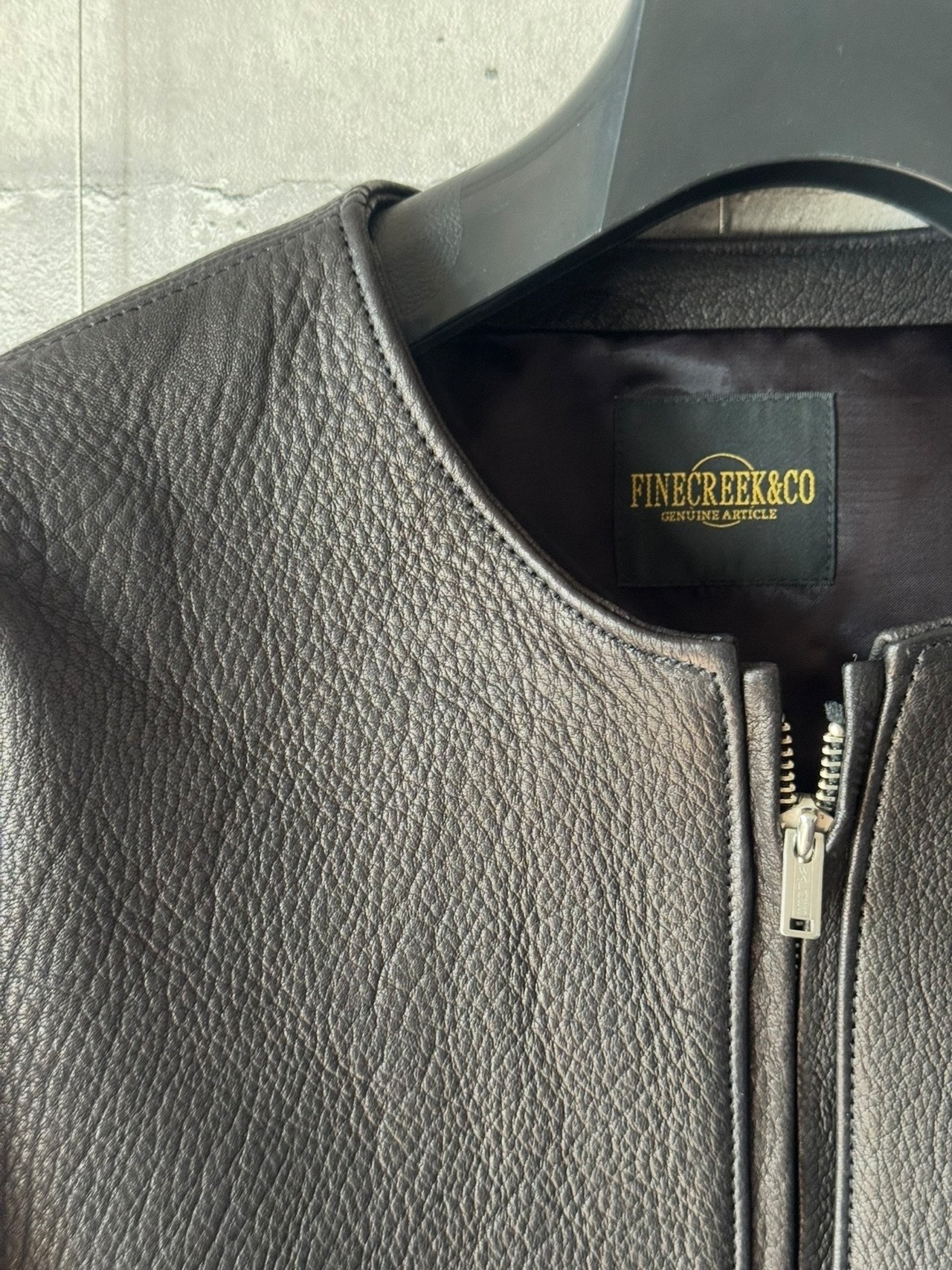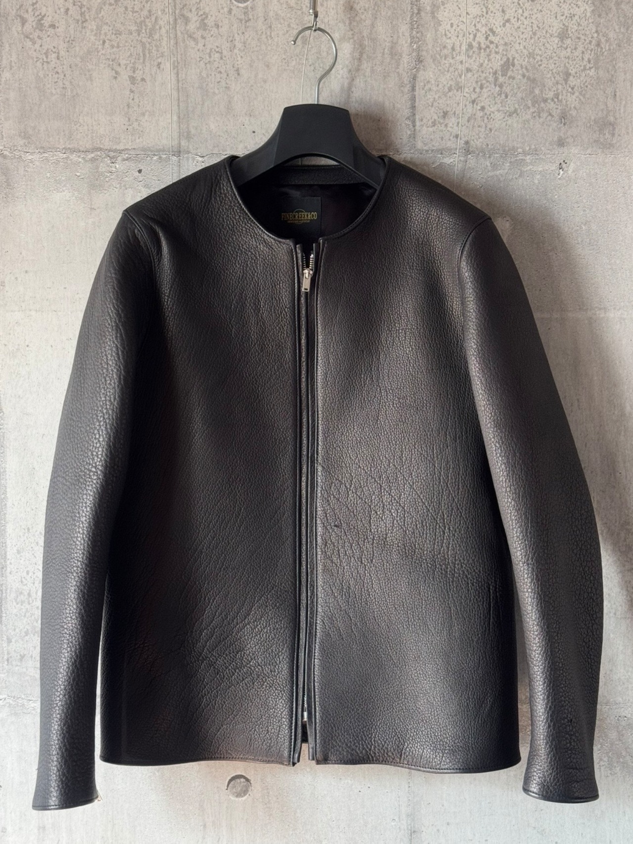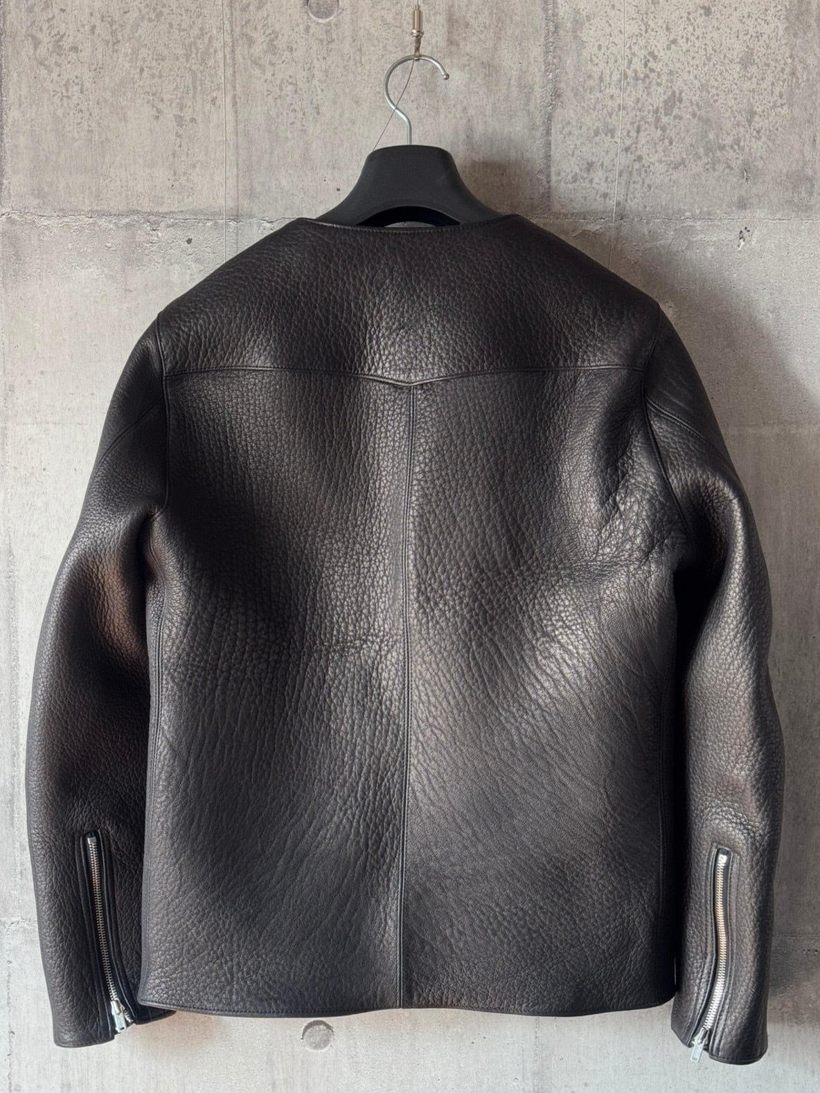 一見ハードな印象だが、着用するとスタイリッシュでノーカラーのためさまざまなスタイルに合わせやすいジャケット。