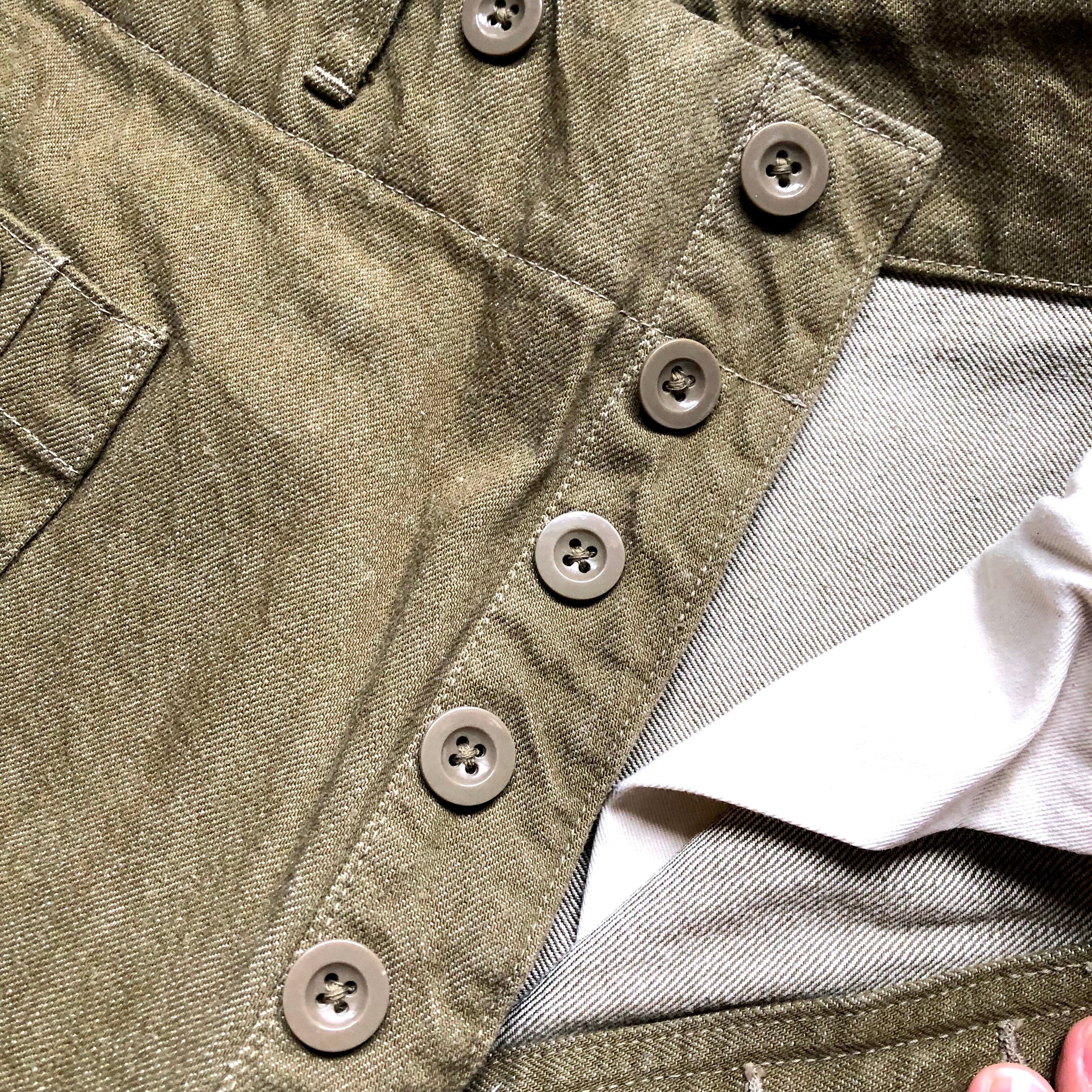 このパンツは当時、初期型のモデルはヘビーウールで作られていたのですが、その後グリーンデニムに変わり、暖かい場所での戦闘用に作られたようです。