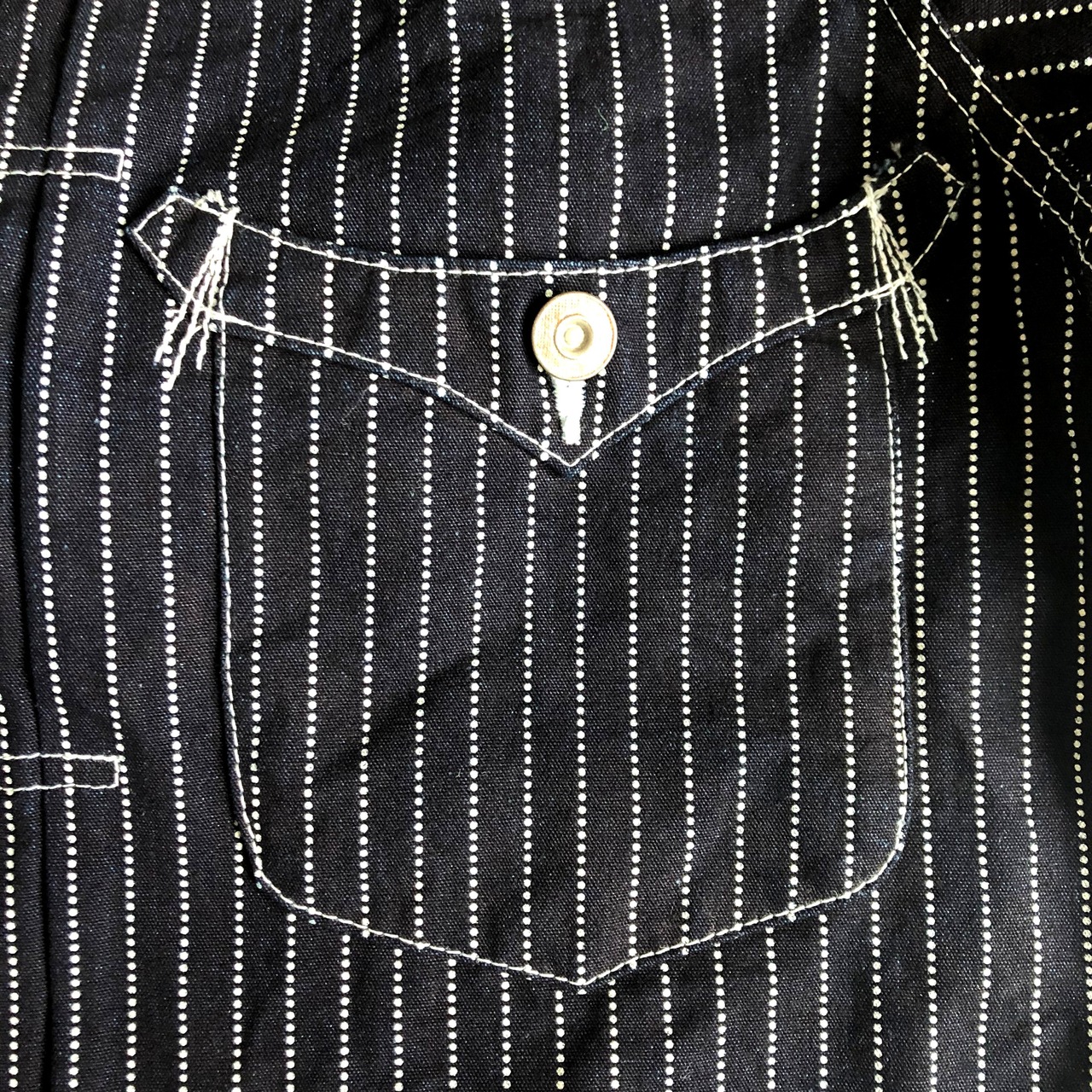 生地は、コットン100%の別注インディゴウォバッシュストライプ生地を使用。