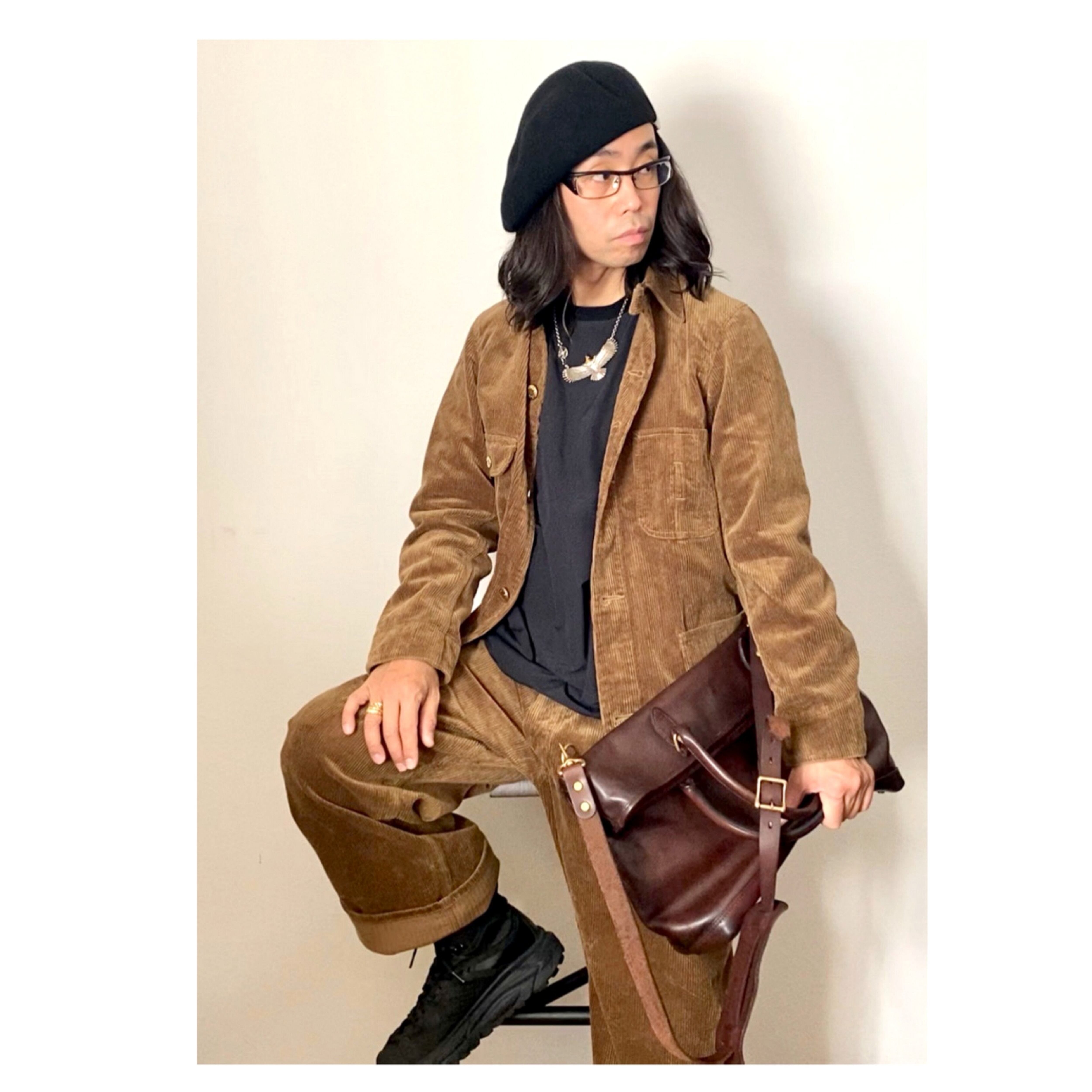 コットン100%の大畝コーデュロイファブリックを使用しており、ヘビーな生地の質感がワークウエアとしての無骨な雰囲気を引き立ててくれ、ファインクリークレザーズのレザーとの相性は抜群です。