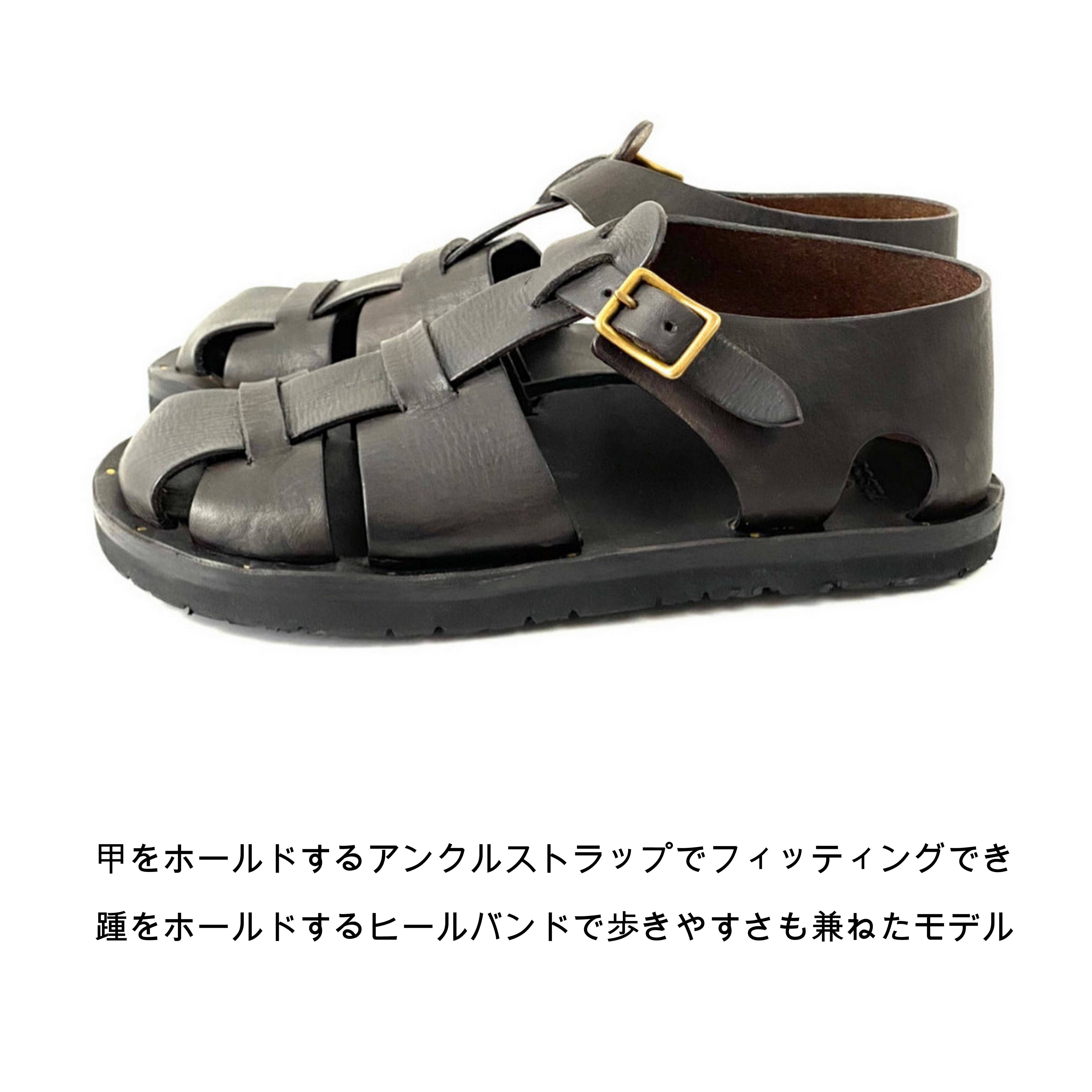 熟練したスキルと手間暇を必要とする伝統的なハンドメイド製法を用いたOLD OILシリーズのサンダルコレクション。世界で最も古い履物の一つとされる「サンダル」。その歴史は古く、古代オリエント(古代エジプト、古代メソポタニアなど)が発祥とされており、何世紀にもわたり国、文化によって多種多様な進化を遂げています。原型は軍士官用のサービスシューズの製造に使用されていたヴィンテージラスト(木型)をベースに、日本人と欧米人の足の形に合う造形へと改良しました。フルベジタブルタンニンレザーの素材特質上、履き込むといろいろな足の形にフィットしていく設計です。フットベッド・ミッドソール(高密度のベンズ)には真鍮製タックス(釘)を打ち込んでカシメ補強。アウトソールは「MORFLEX」と呼ばれるEVA発泡材と天然ゴムを配合した、軽量で柔軟性のある素材vibramソール#「8327」を採用。