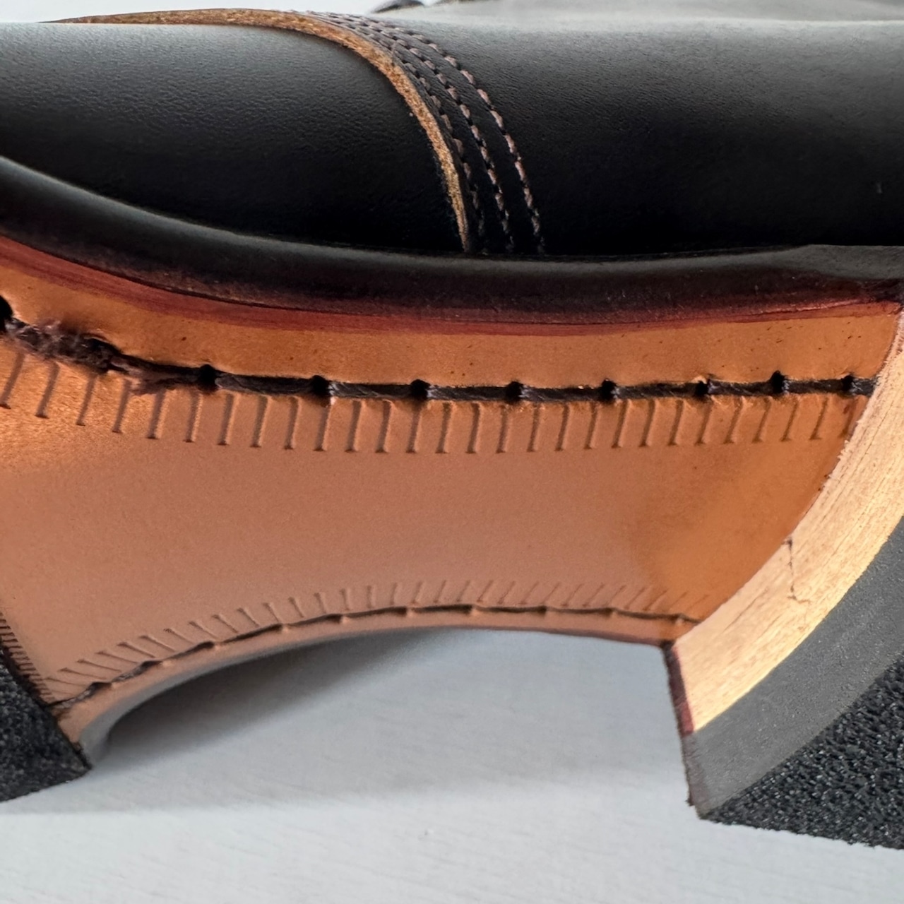 (*)ベベル ウエスト部分の絞りを強調するために、グッドイヤー製法で底付けされたソールのウエスト部分のアウトステッチをウエルトとの革をかぶせて覆う手法。現在でも時折、ビスポーク靴などに見かけます。”Sportif”ではベベルドウエスト風のスタイルをウエスト〜ヒールのマッケイ製法で表現しています。