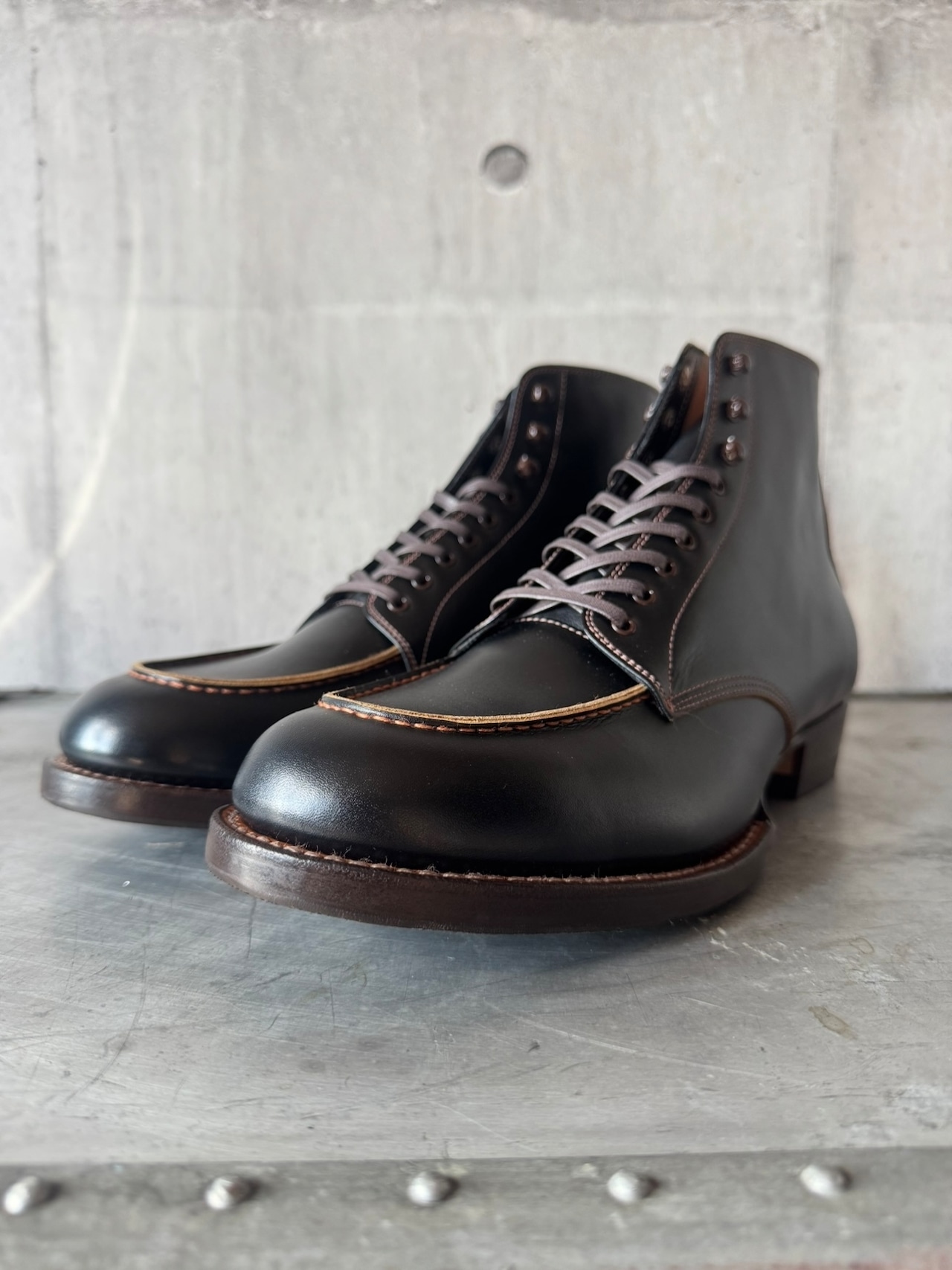 当時、主にヨーロッパのブーツが持っていたディテールを用いながら、同時期に、どちらかというとアメリカで広まった、しかしフランスにも歴史的な関連の深い、モカシン型のつま先デザインを取り入れた、フレンチビンテージテイストのブーツです。