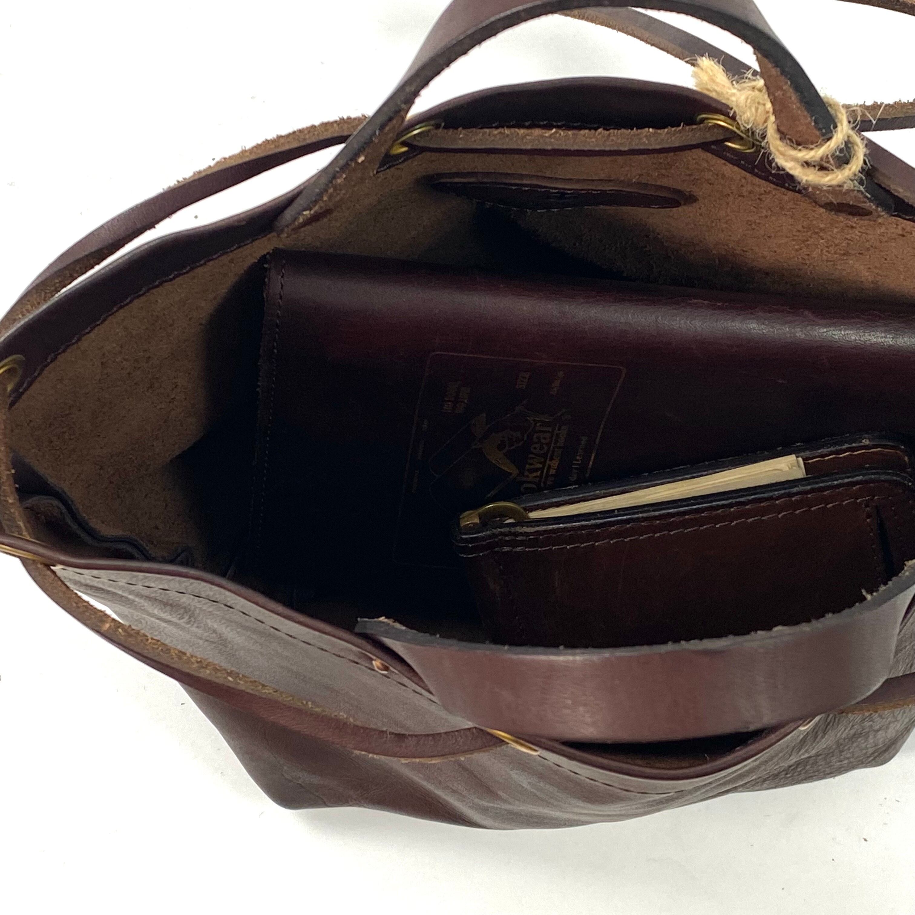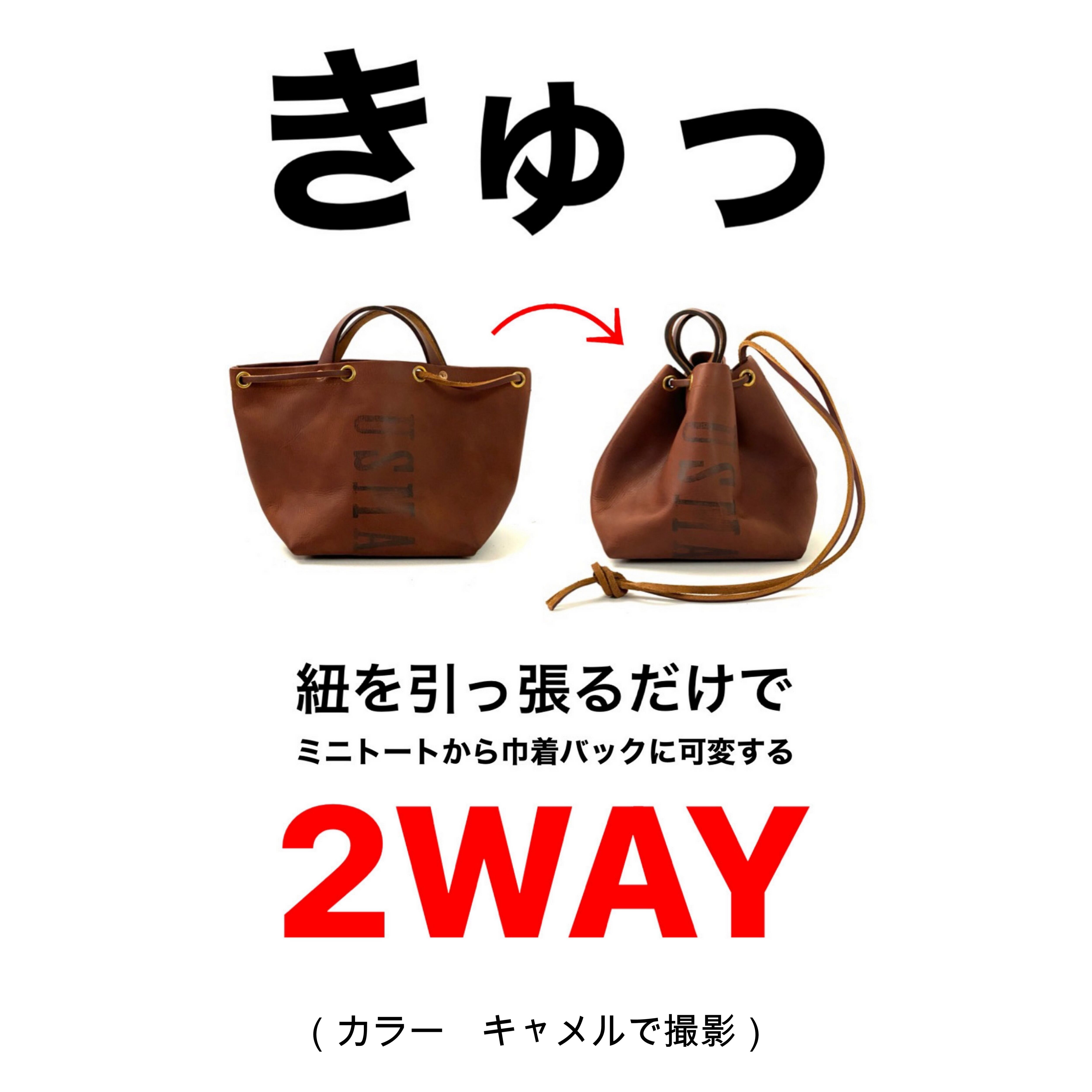 革紐をしぼったり、革紐をしぼらずにハンドルを持てばミニトート。