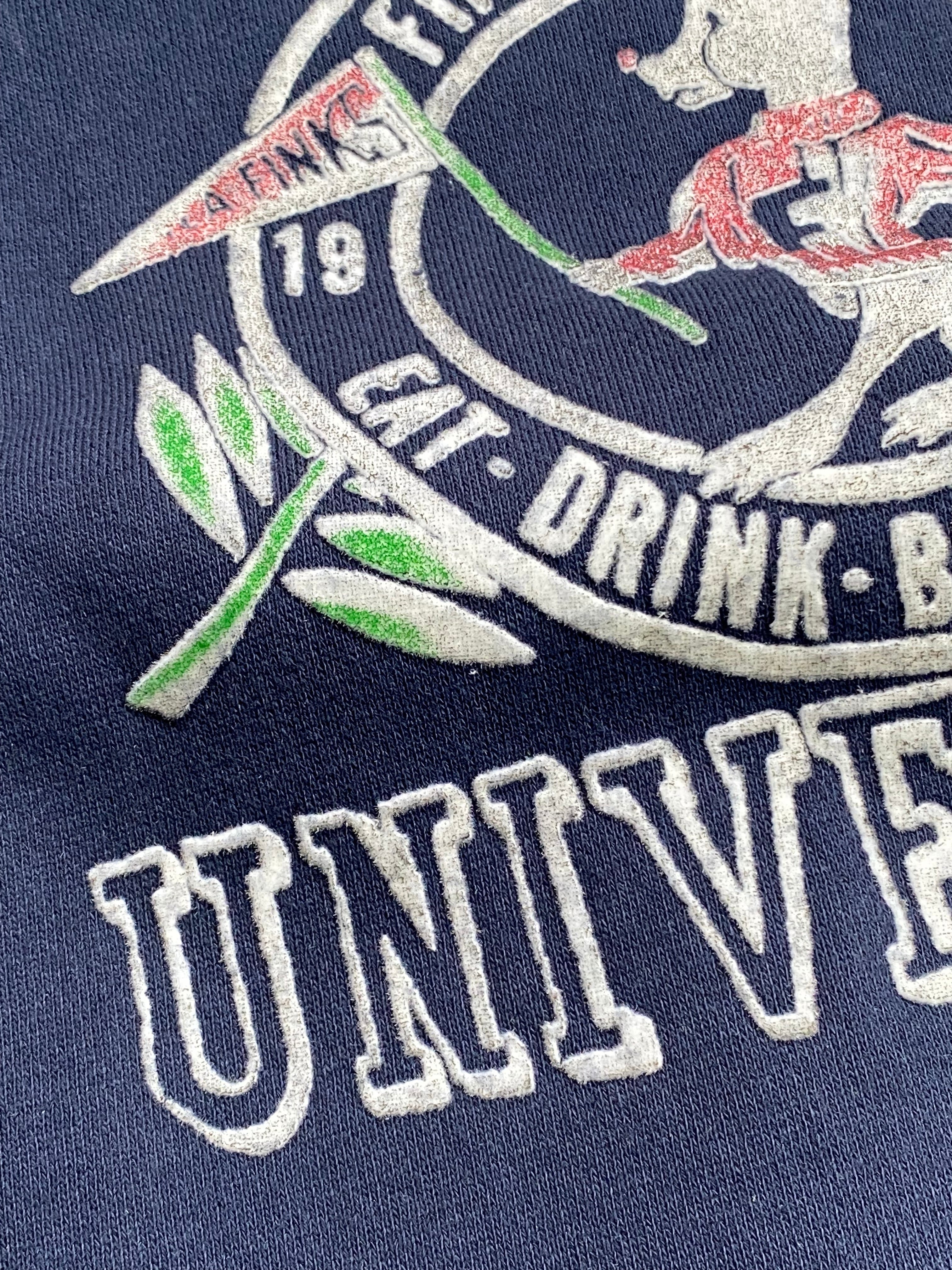 そしてフロッキープリントのカレッジアイテムはヴィンテージの相場ではいまや5万円前後で取引されるほど評価の高いアイテムです。