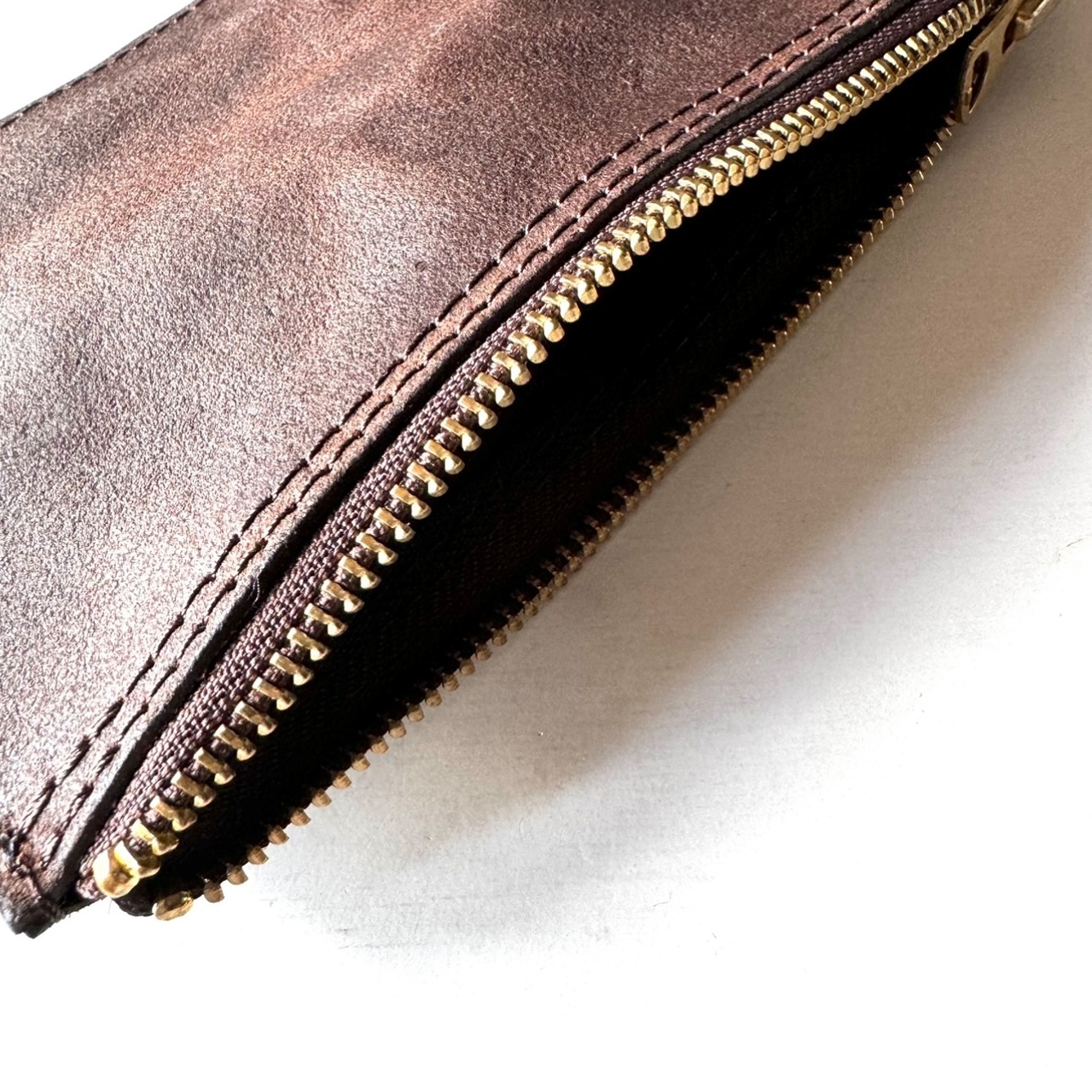 ラフアウト(牛革の床面)のレザーポーチです。手染め、オイル、コガシ加工、”ANCHOR MILLS 社製”スタンプなどでヴィンテージ紙のような風合いに仕上げました。ファスナーはヴィンテージ感のあるUNIVERSALファスナーを使用しまし た。ペンケース・通帳ケースなどにご利用いただけます。ANCHOR'S LOG BOOKとセットもおススメです。