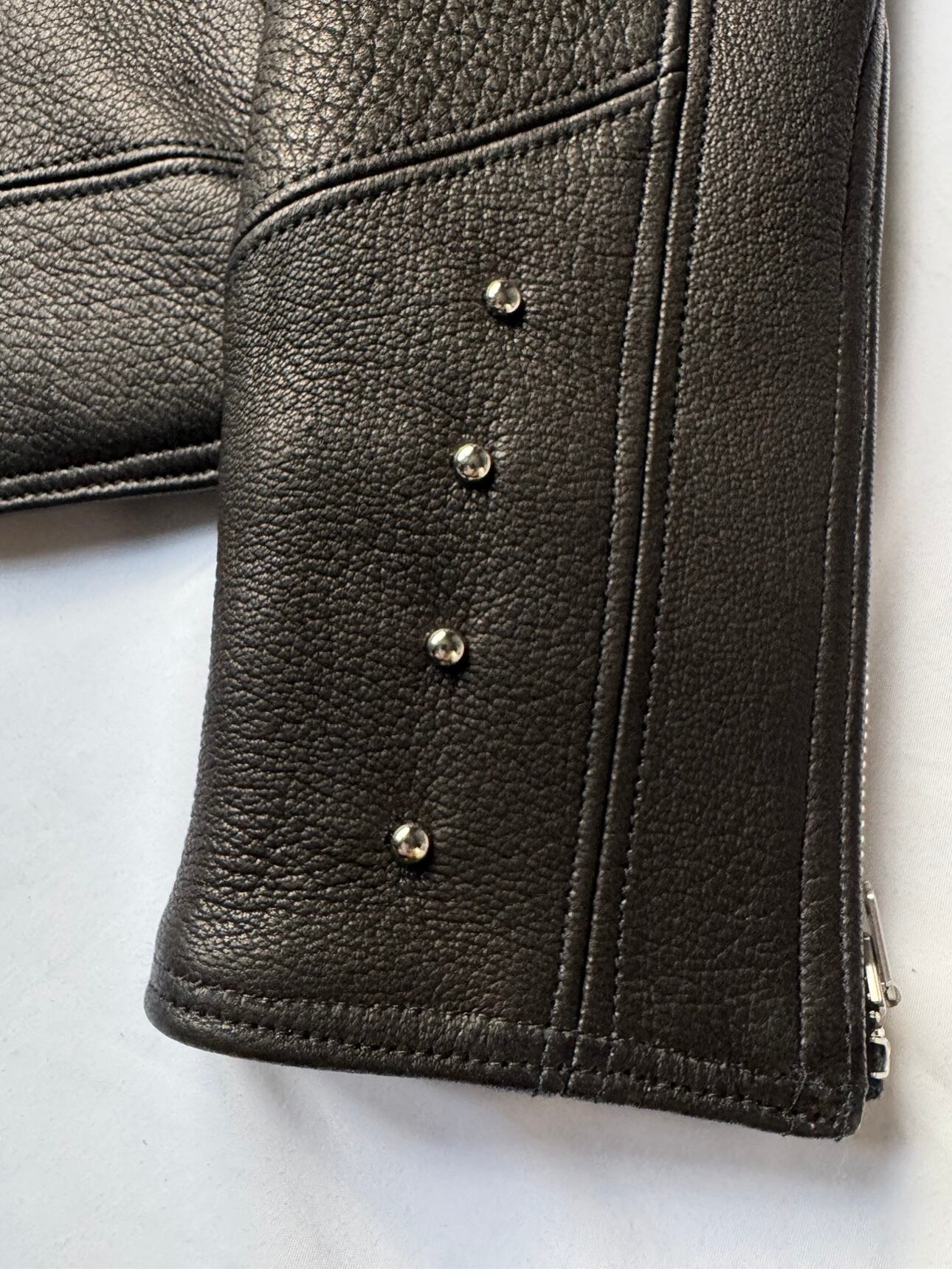 襟のダブルステッチや袖のスタッズ