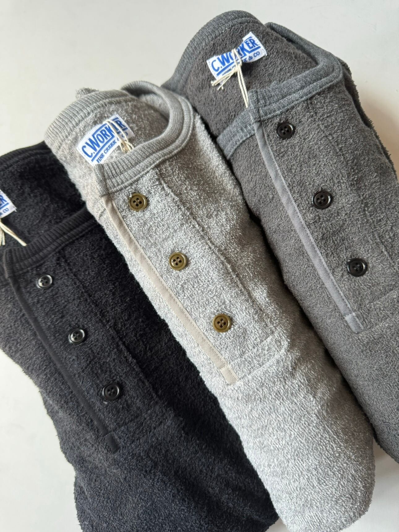 柔らかな肌触りのパイル生地を使用したヘンリーネックTシャツ。