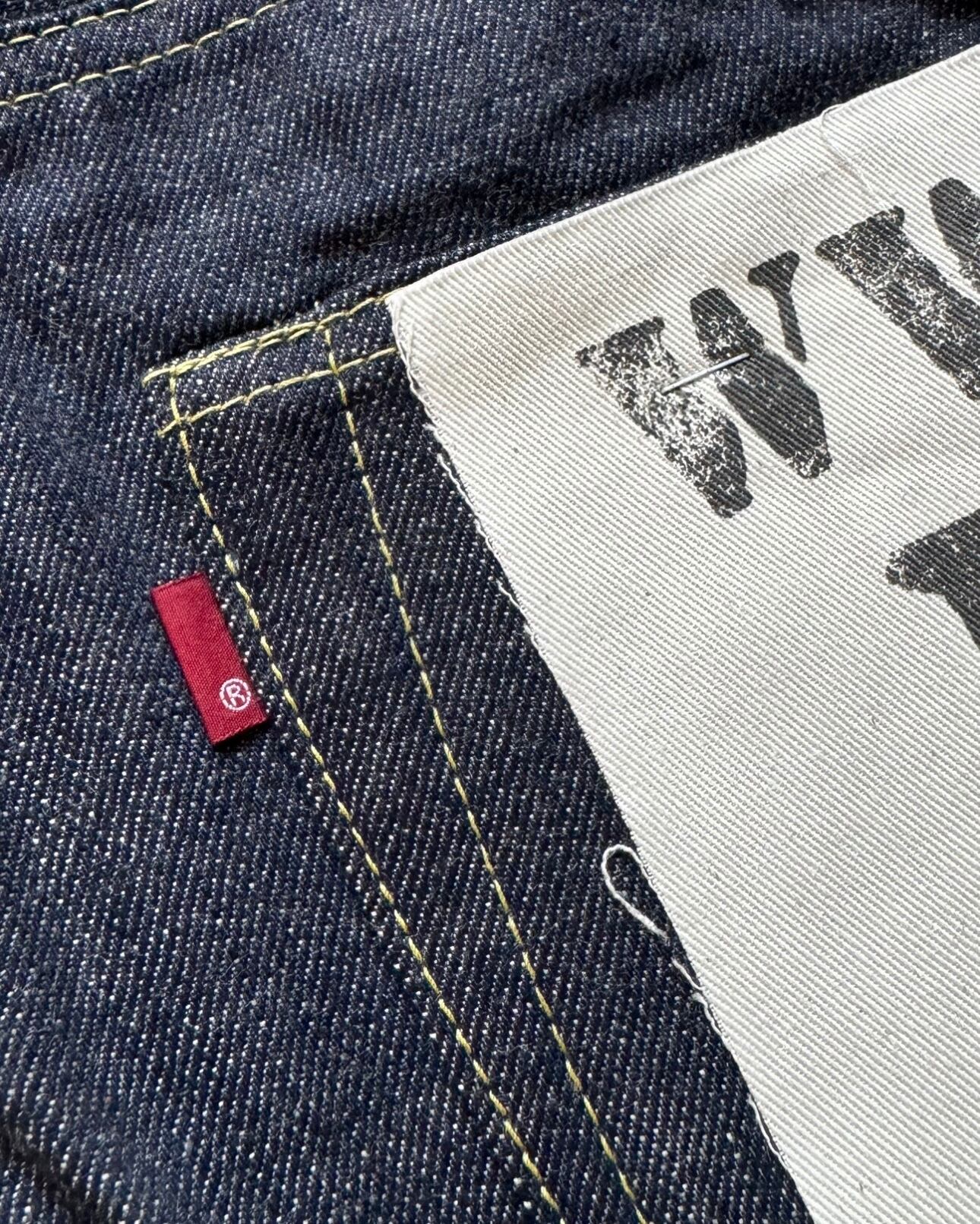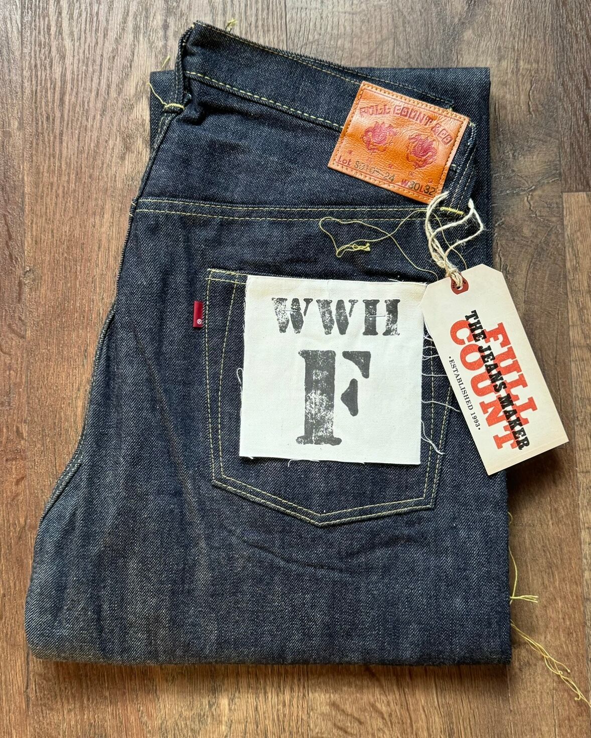大戦モデルの魅力は、戦時中物資等の使用制限のため簡素化されたディテールが挙げられますが、別の角度から見ますと当時人員不足によって別の職場などから駆り出された経験不足を否めない縫子による荒っぽい縫製も魅力の一つだと言えるでしょう。今回フルカウントはその点に着眼し誇張表現することで迫力のある.. 本に仕上げました。ディテールに関しては、0105をベースに若干股上を深くし、ひずみの大きなバックポケット、ポケットスレーキには杢糸を使用したネル、フライボタンにはワンスター唐草ボタン、刻印なしのリベット、持ち出しの下部は折り込まず切りっぱなし、糸つみをせず半製品のような状態で仕上げております。そのままの状態で着用いただくことに何ら問題はありませんが、オーナー様自ら最終の仕上げを楽しんで頂くというご提案でもあります。