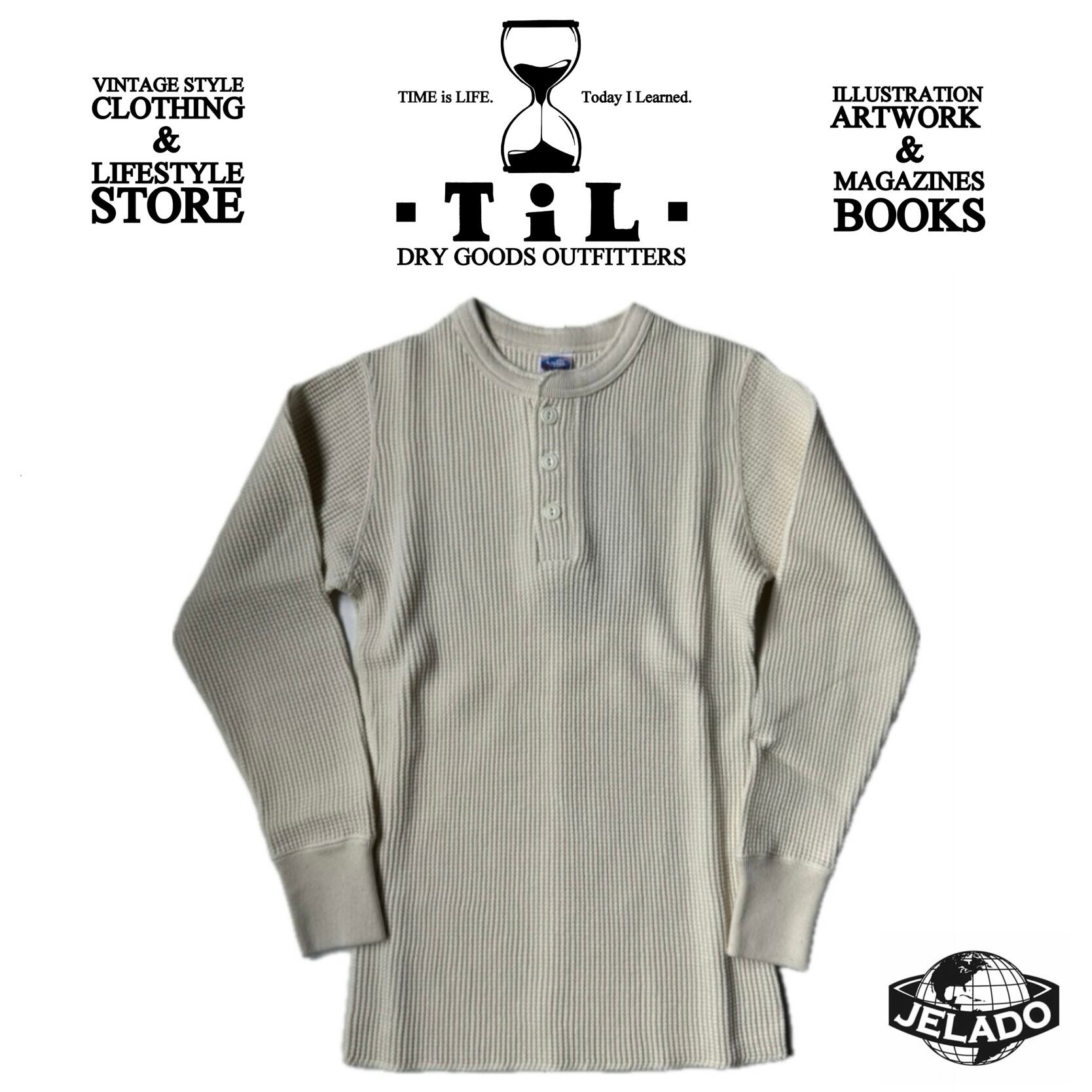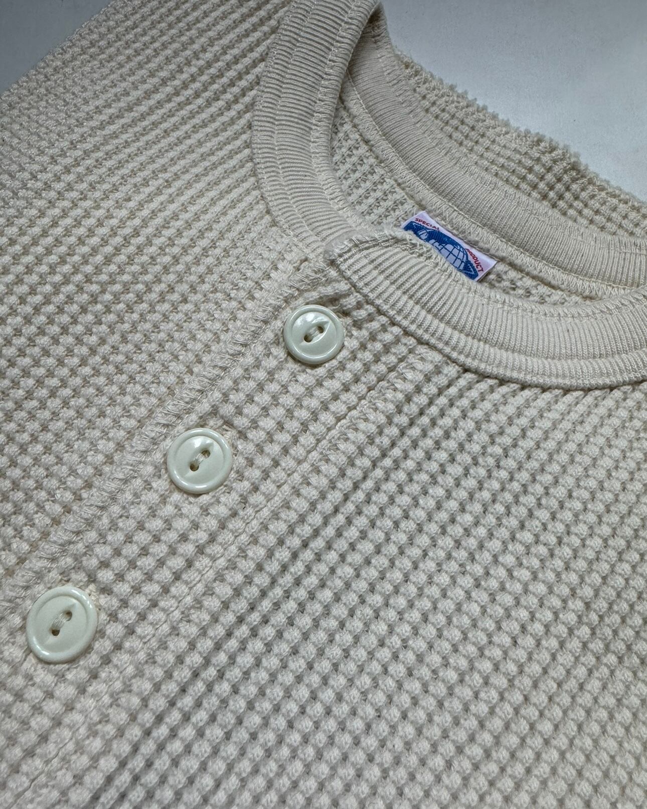 JELADO"ATHLETIC BRAND"のメガサーマル ヘンリーネックTシャツです。一般的なサーマルよりも肉厚(極厚)で強度もあり、伸縮性にとんだ絶大な保温性を約束する、最高のインナーウェアです。通常、丈夫で強いヘビーサーマルと言われるものでも30/-(さんじゅばんたん)糸で編まれたものになりますが、JELADOが提案するのは10/-(じゅうばんたん)糸、かなり太い糸で編まれたサーマル生地を採用しています。世に流通するサーマル素材の中では、最高にぶ厚く、見た目にも分かる、ワッフルの目面が大きく凹凸がハッキリしています。その為、空気の層が入りやすく、保温性を高めてくれます。タイトな作りになっていますが、体に合わせてよく伸び、洗いこんだ際もフンワリとした柔らかさは変わらず、その着心地はずっとキープされます。もたつき無いサイジングですので、重ね着する際もアイテムを選ばず、程よい着丈の長さと、その肉厚さは一枚でも違和感はありません。バインダーネック仕上げ、各リブは締め付けの強いモノを使用。一度着用すれば、秋冬には欠かせないアイテムとなってくる事は間違いありません。布地の特性上、同サイズでも商品に約1〜2センチ程度の個体差が生じる場合がございます。予めご了承下さいませ。