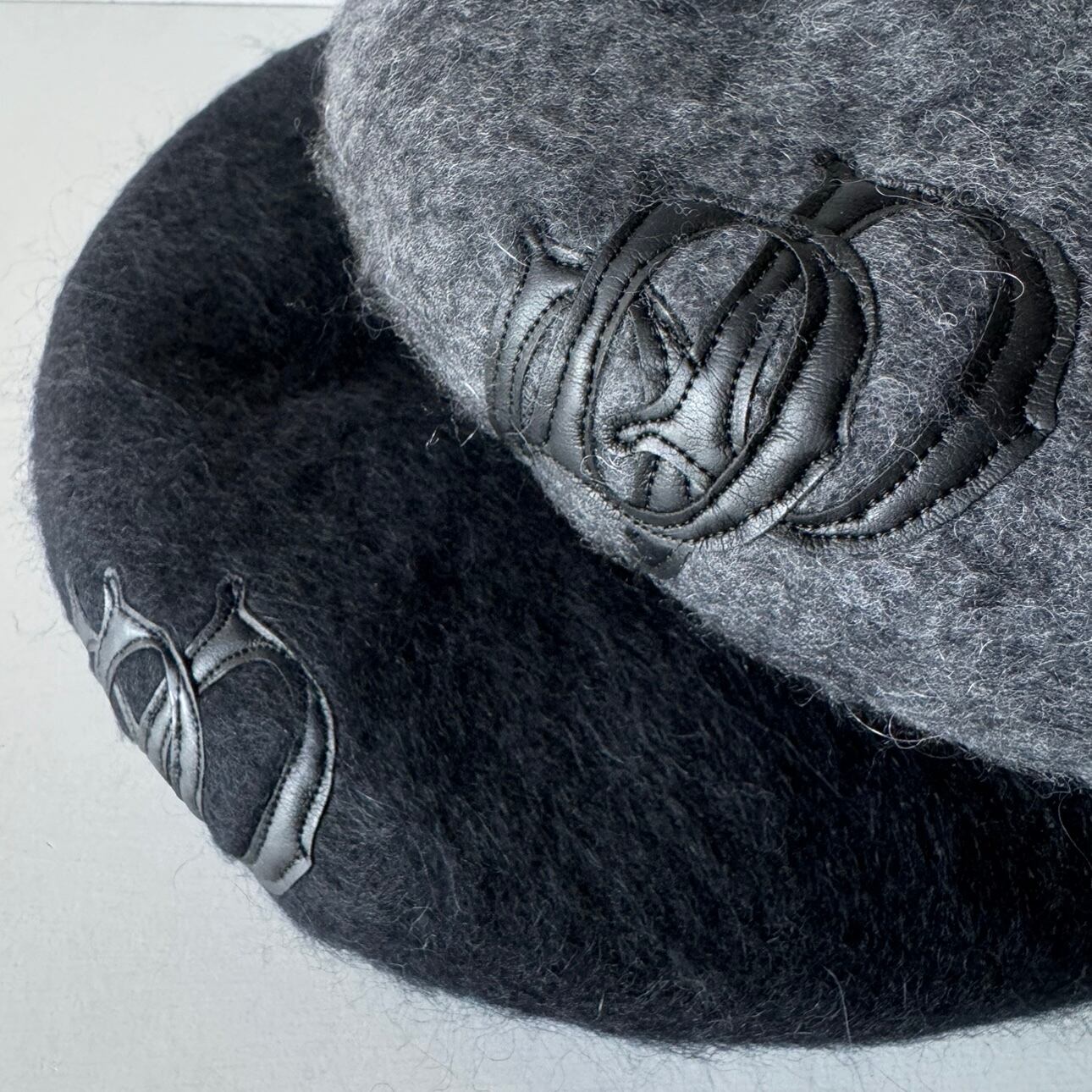 素材はウールアルパカで毛足のある温かみのある毛糸をフェルト化した生地を使用し、被って左横に『D』シンセティックレザーワッペンを3つ重ねたデザインとなっています。