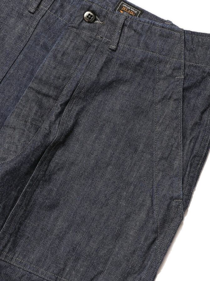 米軍が1947年に採用したヘリンボーンツイルを使用したベイカーパンツを10.5オンスのLASTRESORTDENIM青タグで仕立てました。ベイカーパンツはもともと、パン職人(ベーカー)が着用していたことからその名前が付けられたと言われています。別名